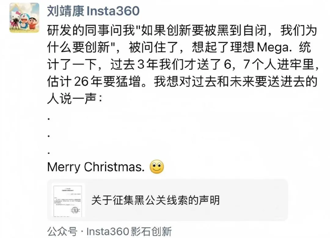 这是影石创始人刘靖康在朋友圈发的一段话,字里行间充满火药味。