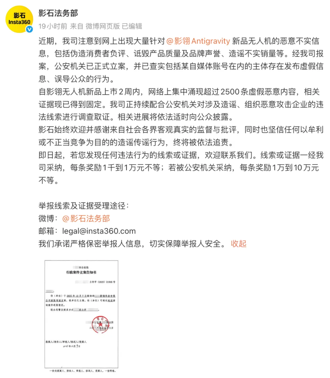 与此同时,影石还发布了一记“江湖悬赏令”。公开悬赏最高10万元,征集“黑公关”线索:相关举报被公司采纳,每条奖励1000至1万元;线索移送公安机关并被立案,每条奖励1万至10万元。