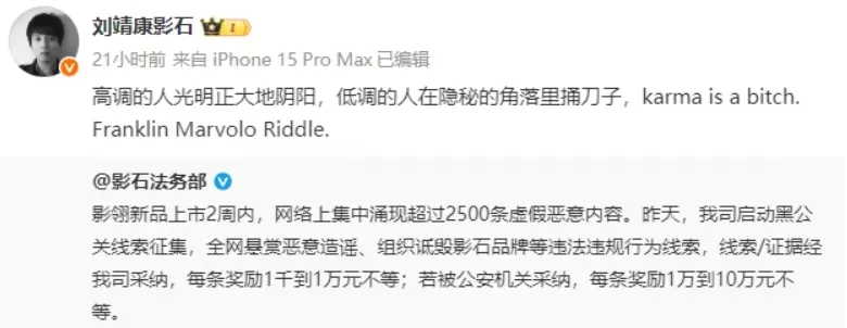 影石法务部悬赏征集黑公关线索的微博也被创始人刘靖康转发,并配文“高调的人光明正大地阴阳,低调的人在隐秘的角落里捅刀子。”被网友认为是在阴阳大疆耍手段。