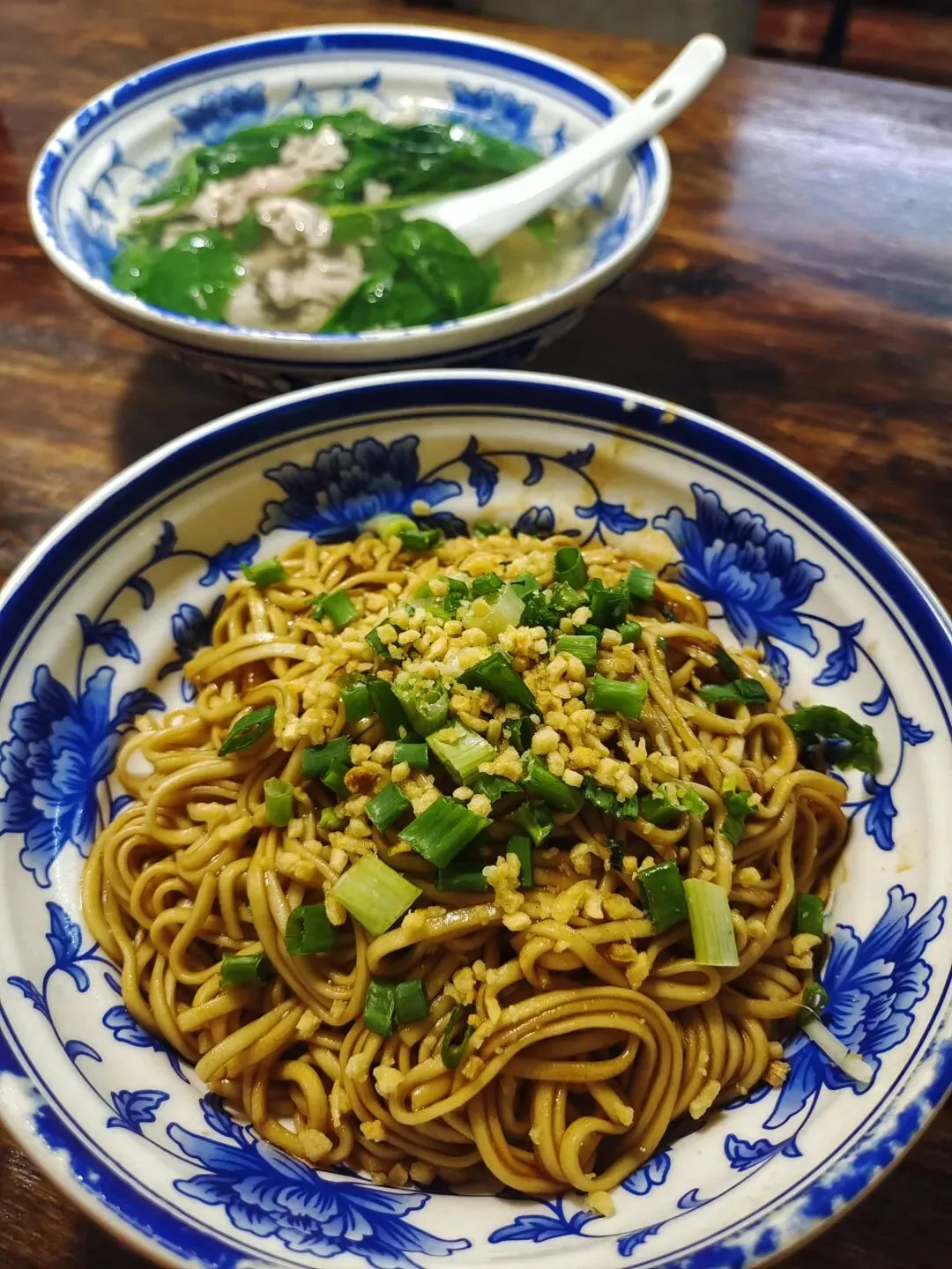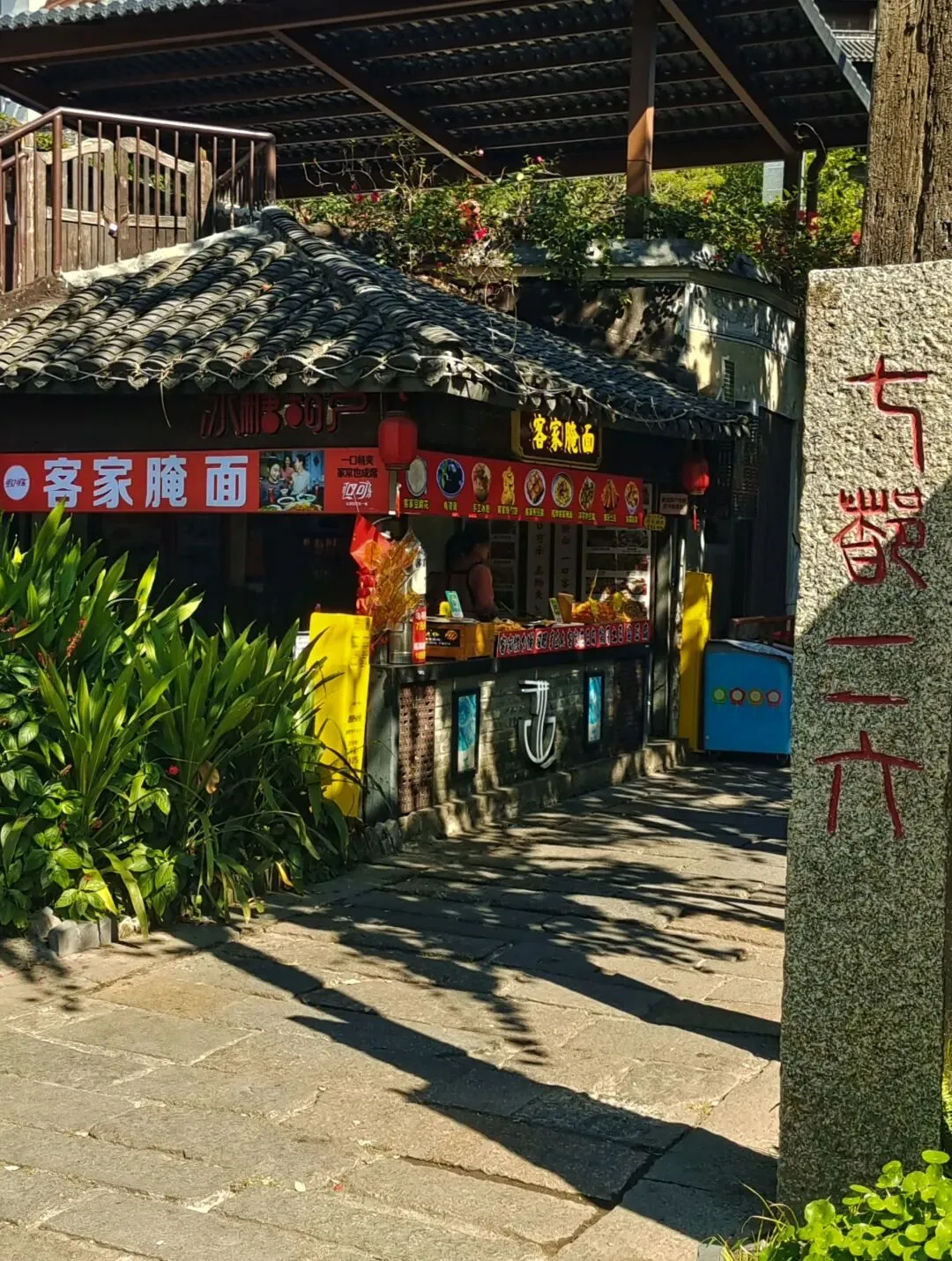 中午时分,来到关帝庙附近的一家客家餐馆,点了一份客家特色餐食,腌面配三及第汤。腌面是客家看家餐食,"腌"在客家语中有"搅拌"的意思,就是将煮好的碱面加入用鱼露、酱油、料油调好的料汁,再撒上炸得金黄的蒜蓉和青翠的香葱花即成。三及第汤,取三甲及第的好寓意,用枸杞叶煮汤,氽入猪肉片、猪肝等猪杂,汤色清澈,肉片鲜嫩,枸杞叶清香,与腌面绝配。