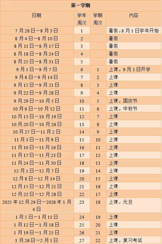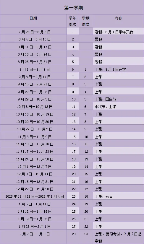 2025-2026学年普通中小学校校历显示