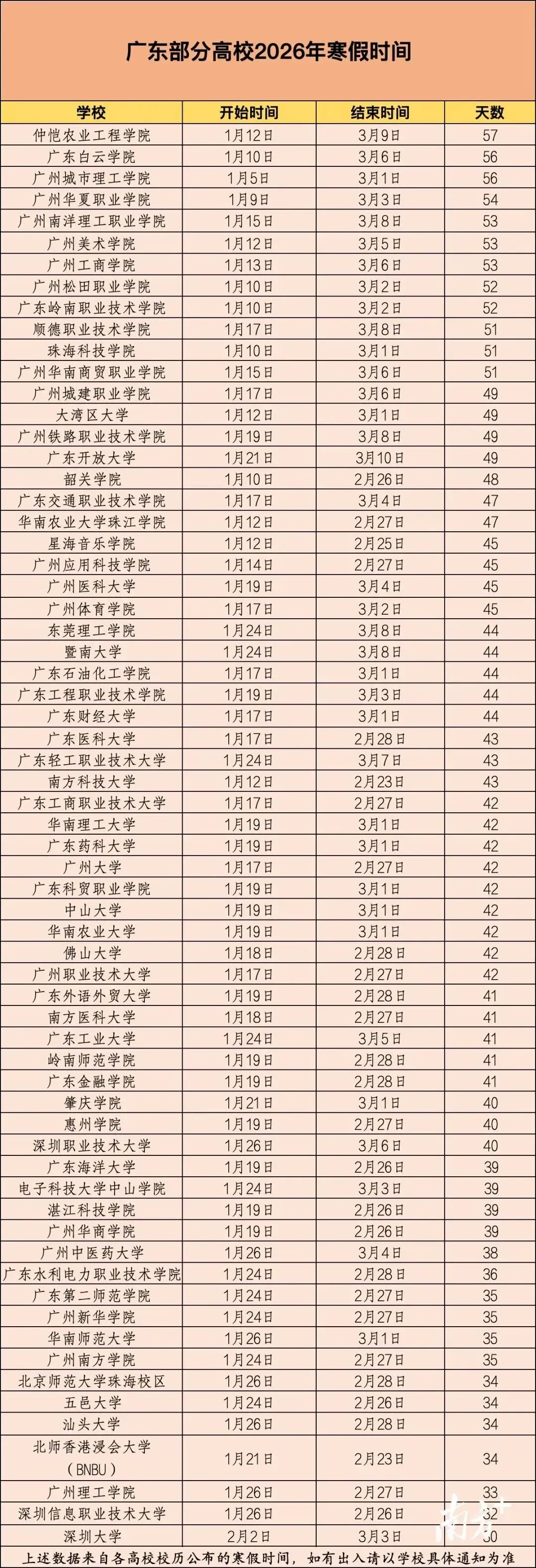 广东高校具体寒假时间