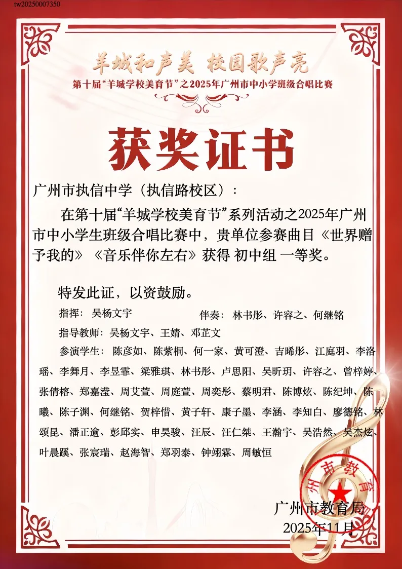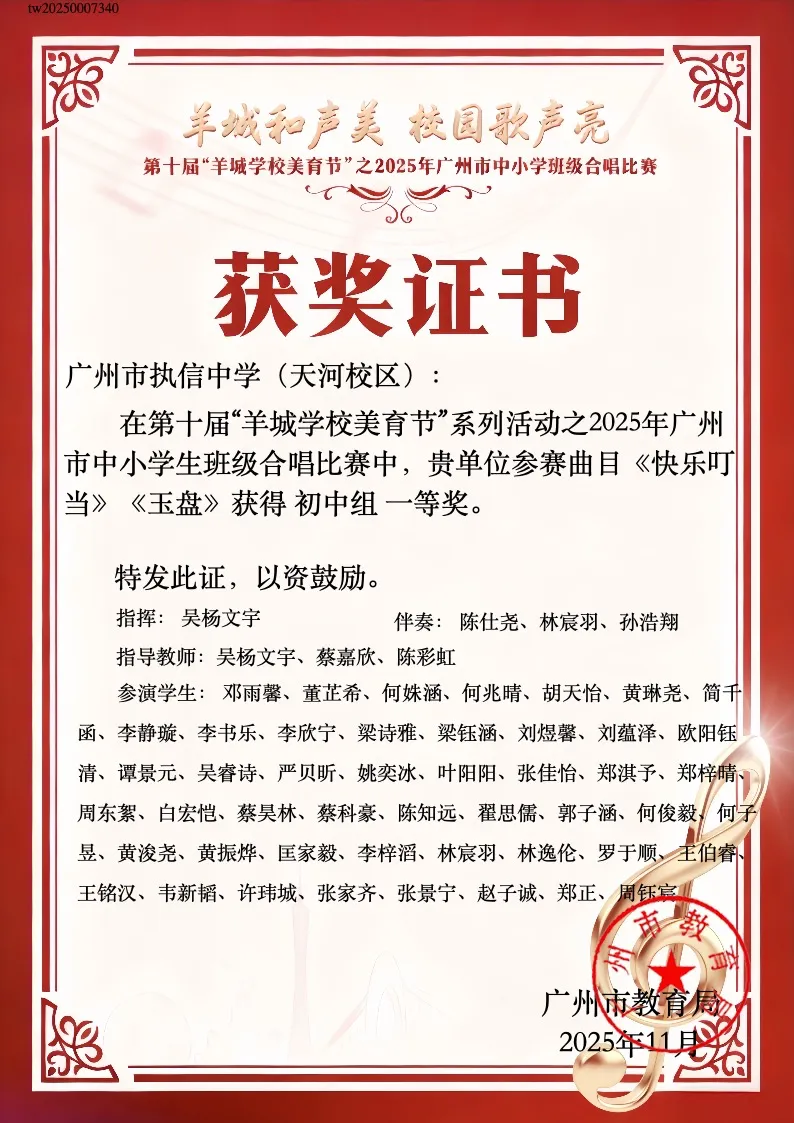在2025年10月18日广州市中小学班级合唱比赛中,我校执信路校区初二3班与天河校区初二4班凭借出色的艺术表现与默契的团队合作,双双荣获广州市班级合唱比赛一等奖!我校指挥艺术科吴杨文宇老师获评优秀指导教师。
