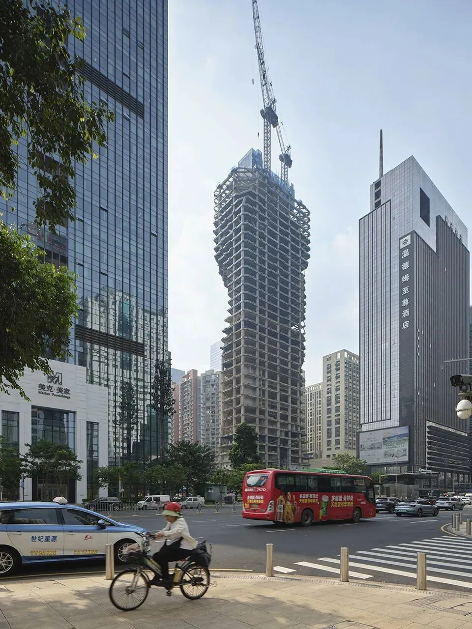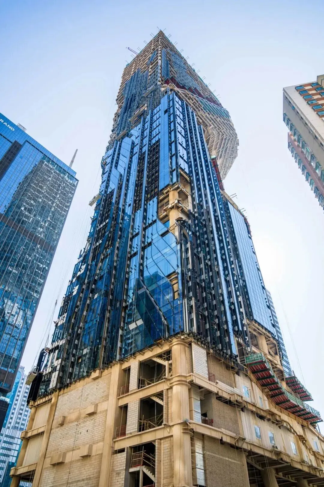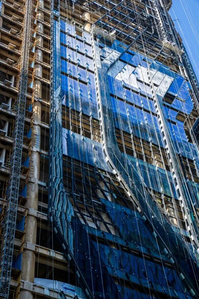 目前,大厦的主体结构已完工,进入幕墙安装施工阶段。其独特的建筑形体轮廓清晰呈现;当下施工工作正围绕扎哈・哈迪德建筑事务所打造的塑型外立面展开,这一外立面的设计既充分考量建筑的日照采光条件,也确保周边区域不会陷入建筑阴影之中。