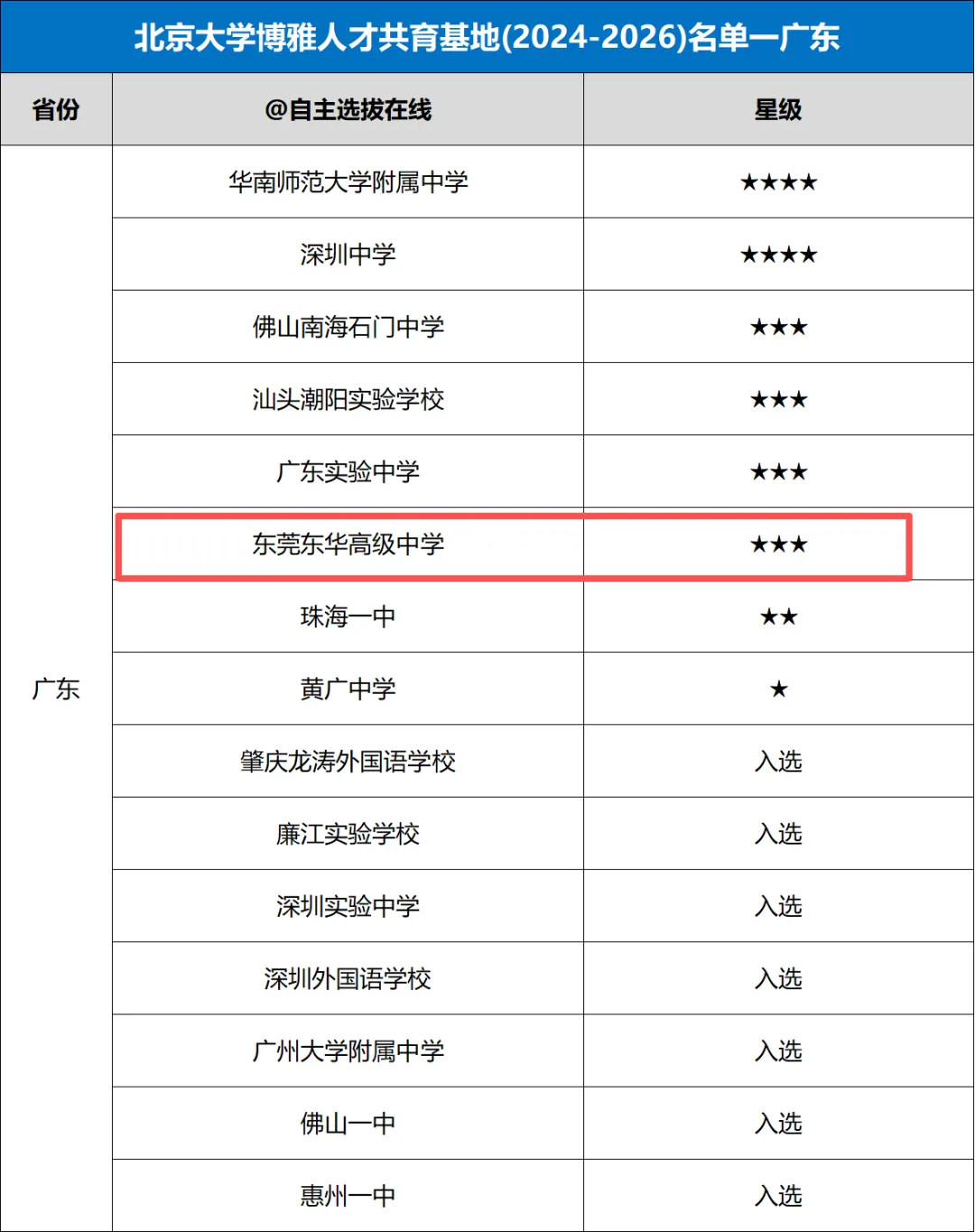 除了华附和深中这两所四星高中,广东还有13所高中入选了北大博雅人才共育基地,它们虽然星级不同,但各有特色,来看看你的学校是否入选了⬇️
