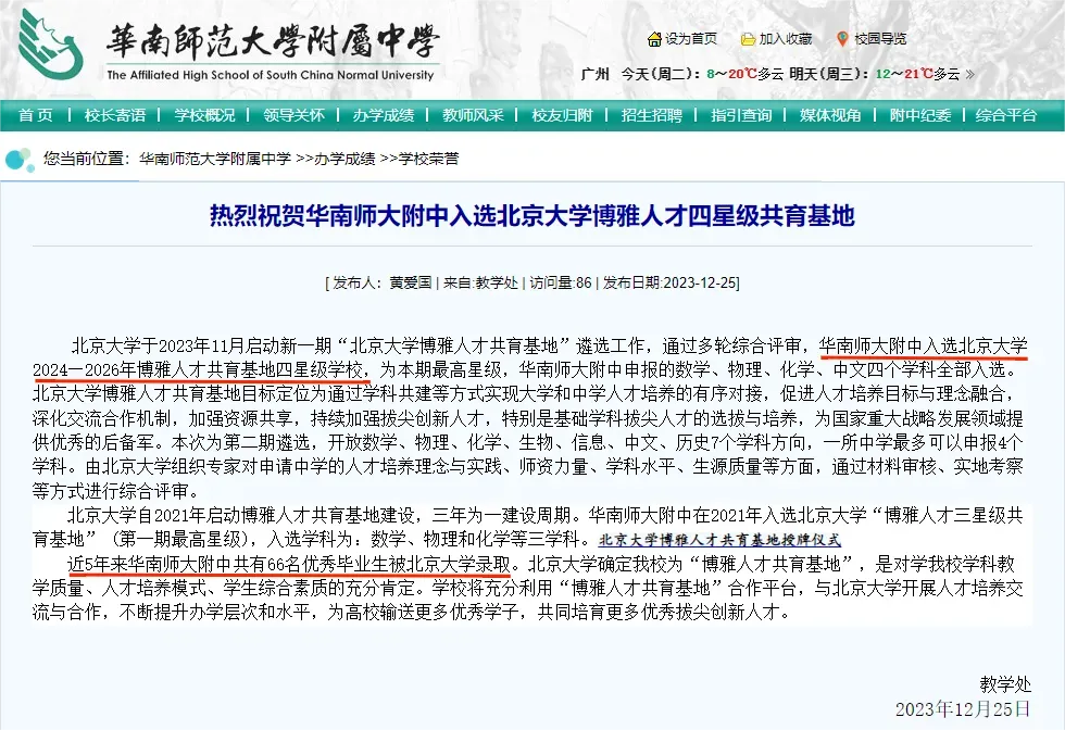 近日,北京大学博雅人才共育基地的遴选结果引发了广东学子们的广泛关注。全国已有超230所高中入选该基地,而广东就有15所高中成功入选,其中华附和深中更是连续两个批次都以最高星级入选,成为众多学子眼中的“明星学校”。那么,这些入选的高中究竟“强”在哪里呢?和营长一起来深入了解一下。在广东入选的15所高中里,华南师范大学附属中学和深圳中学连续两个批次都以最高星级——四星入选,这充分彰显了它们长时间保持的高教学质量和北大对其办学水平的高度认可。