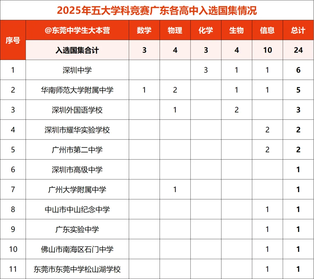 从上图可以发现,今年入选国集的深圳中学、华南师范大学附属中学、深圳外国语学校、广州大学附属中学、广东实验中学、佛山市南海区石门中学6所中学也都入选了北京大学博雅人才共育基地。学校的学科竞赛成绩无疑是入选的重要参考之一!