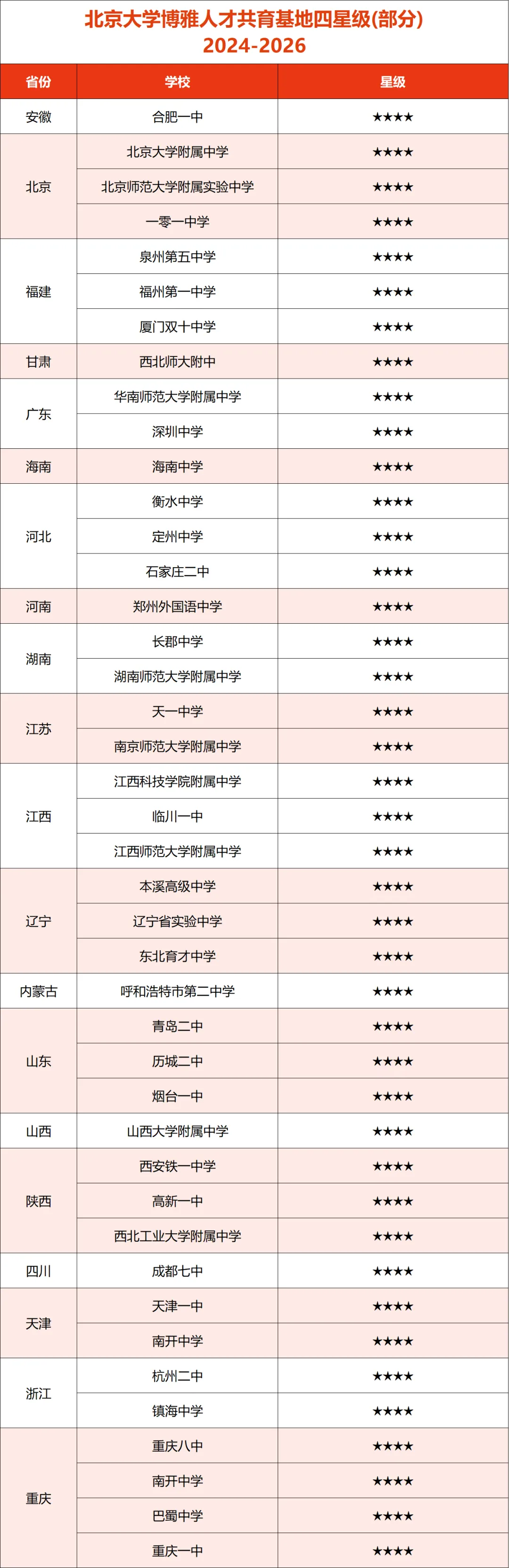 目前,全国共有230余所高中入选北大博雅人才共育基地,而四星基地仅有42所,有些省份全省仅一所高中入选四星基地,竞争之激烈可见一斑。