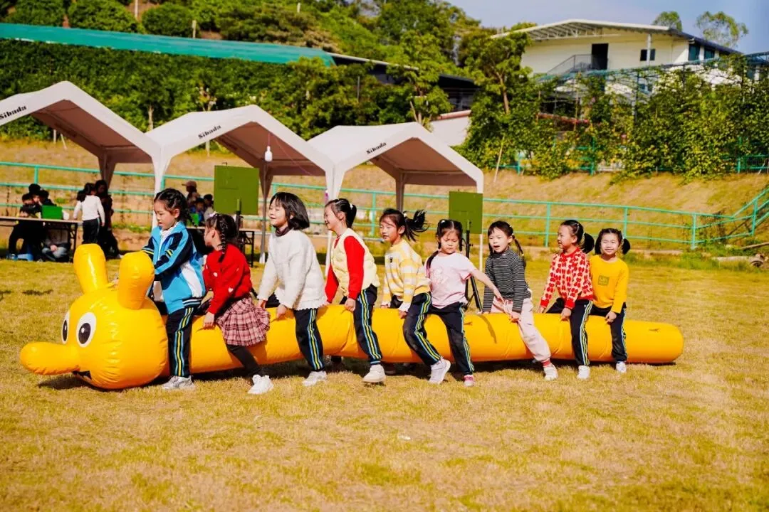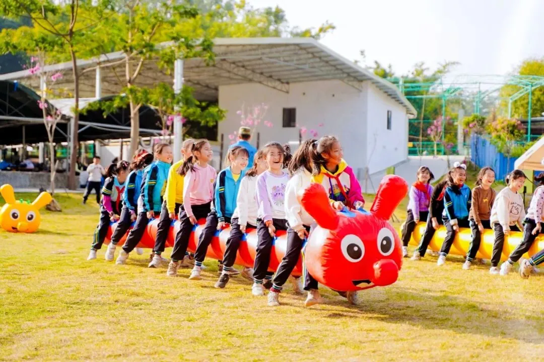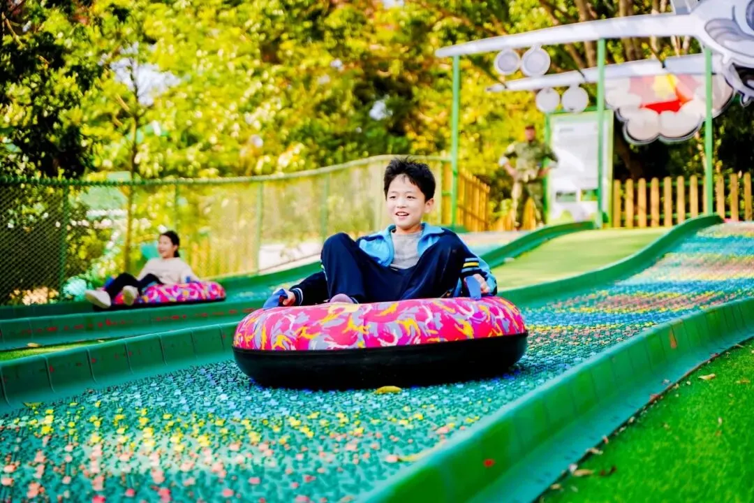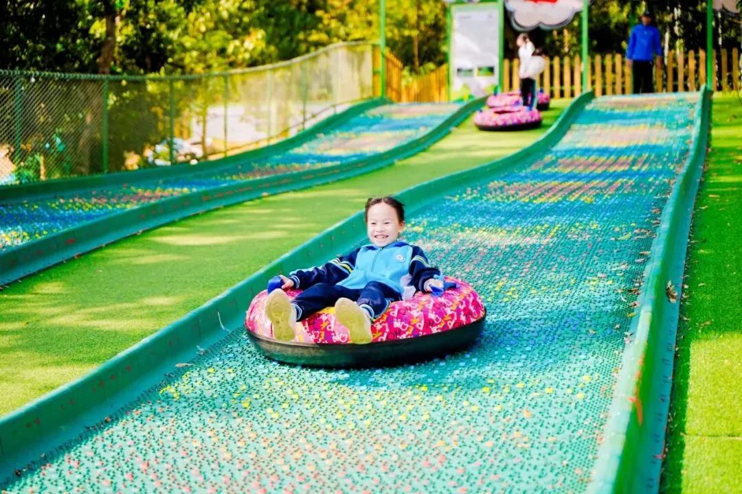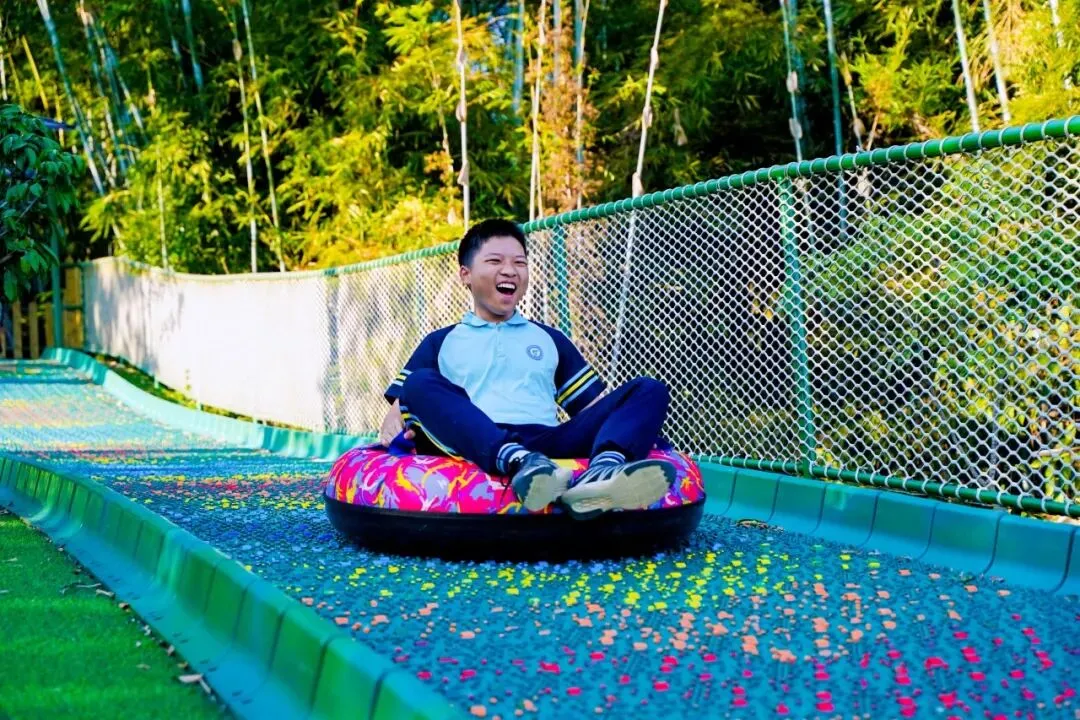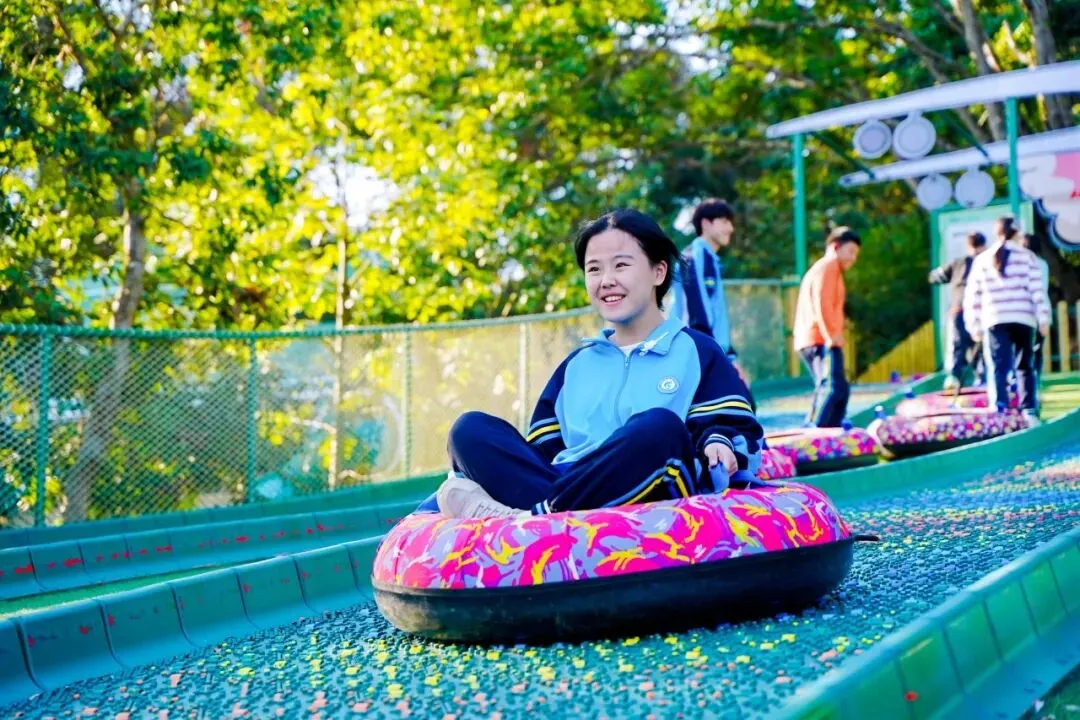 色彩绚丽的彩虹滑道如一道缤纷的云梯,蜿蜒铺展在绿意盎然的场地中,这里成为了我们身心放松的乐园。同学们的眼神里满是期待与兴奋。每一次滑行都充满了畅快与刺激,同学们的欢声笑语响彻全场,尽情释放着少年的活力与朝气。