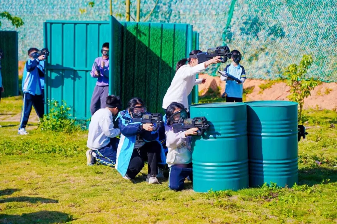 换上装备的同学们瞬间 “变身小战士”,组队后迅速商量战术 —— 有人负责 “冲锋”,有人蹲守 “掩护”,哪怕汗水浸湿了衣领,也没人停下脚步,在紧张的对战里,团队默契悄悄升温。