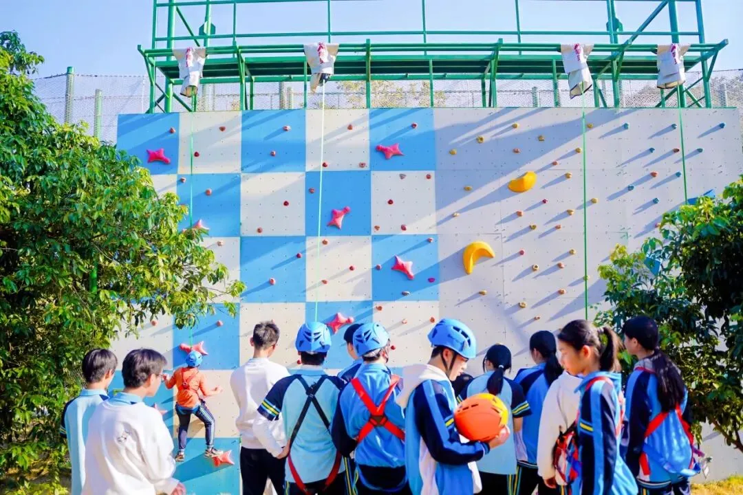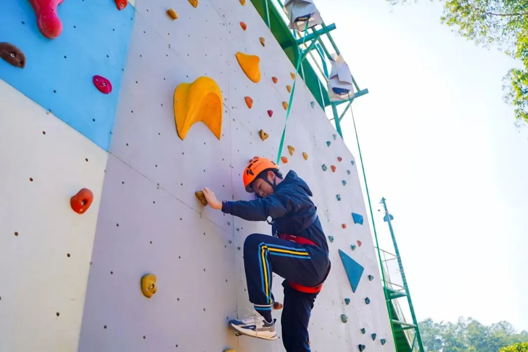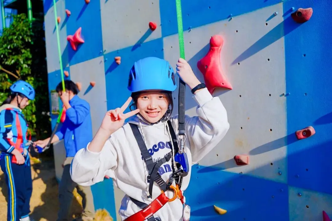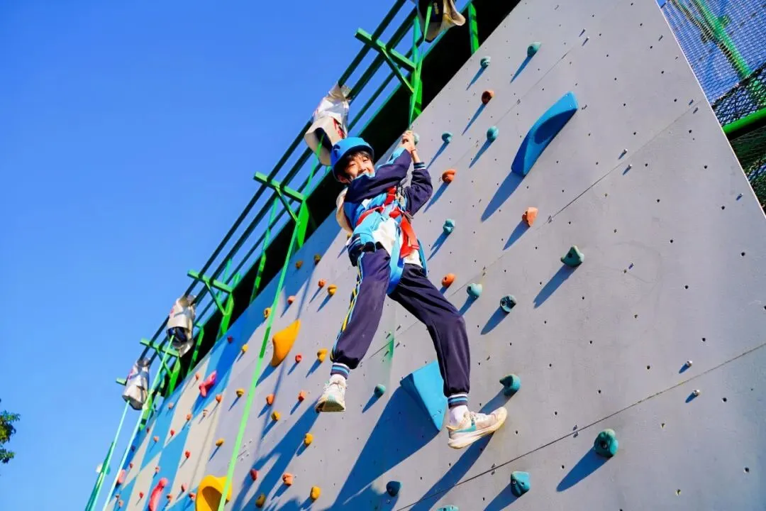 望着岩壁的同学们起初还有些紧张,但在教练的指导下,慢慢找准着力点向上攀爬,哪怕中途腿有些抖,也咬着牙坚持到了更高处,当摸到顶端的那一刻,脸上满是 “突破自我” 的骄傲。