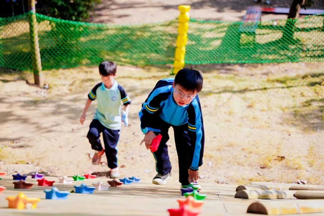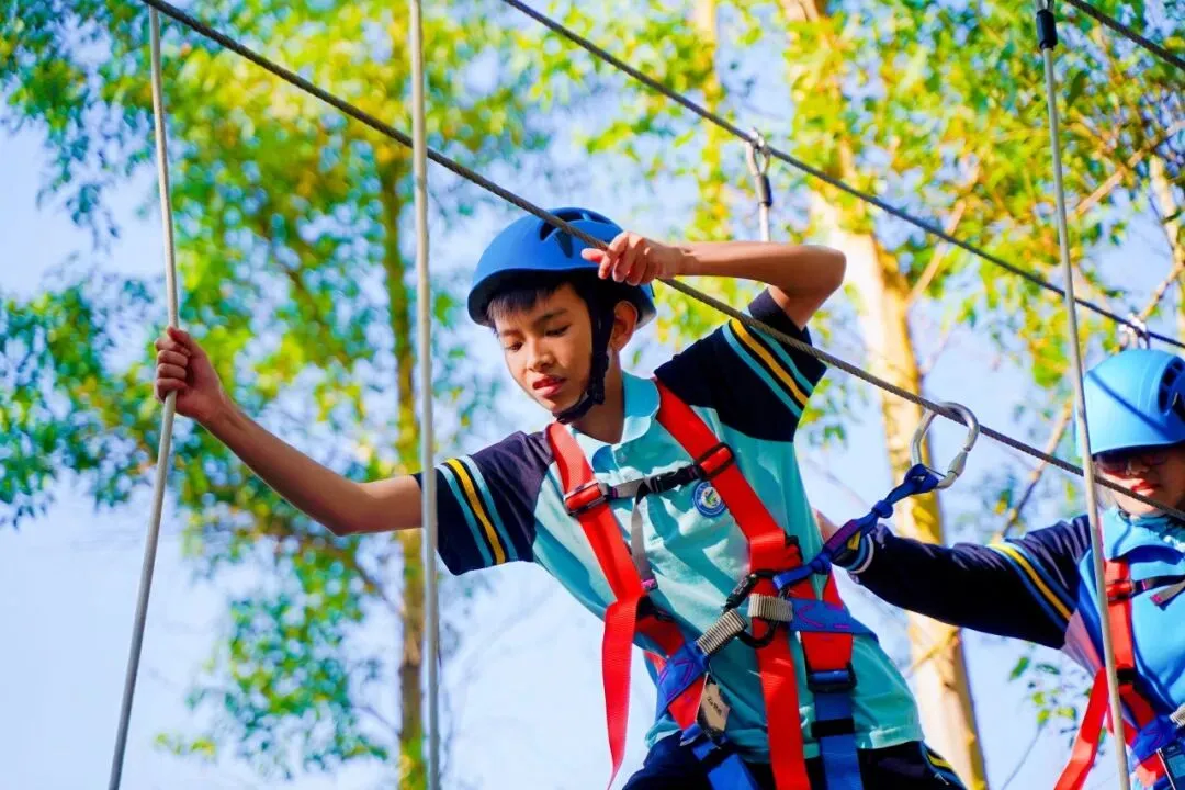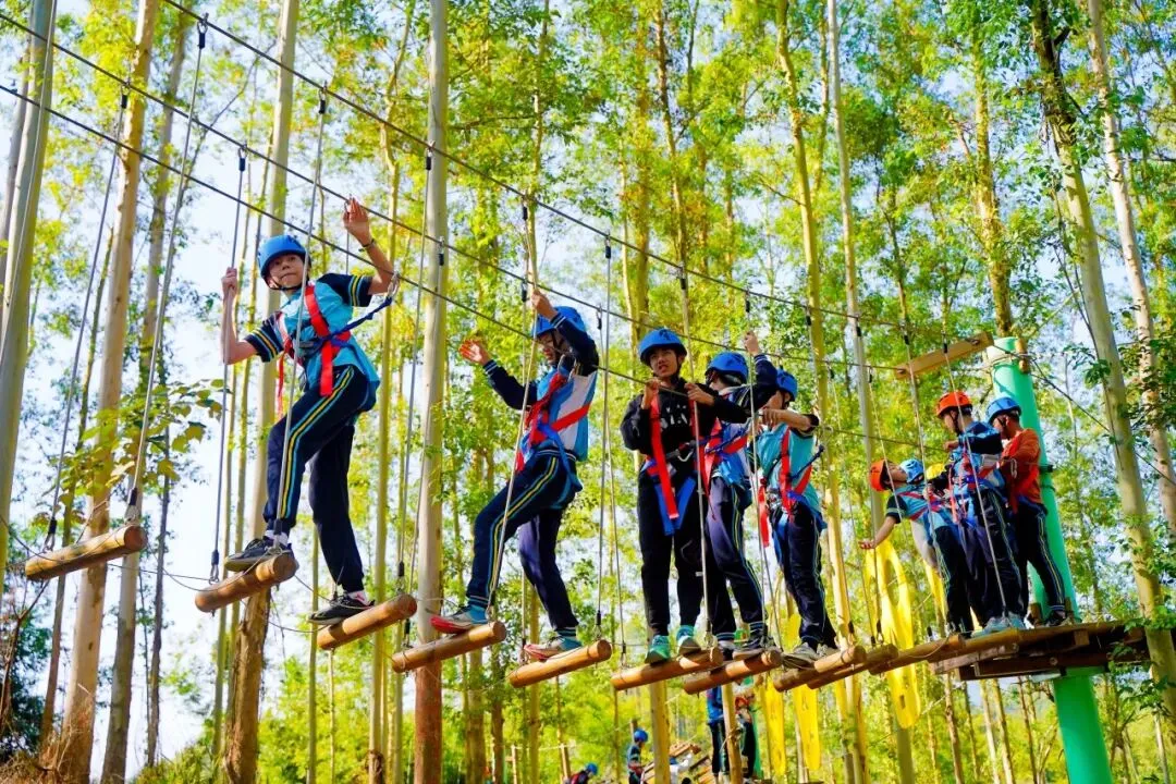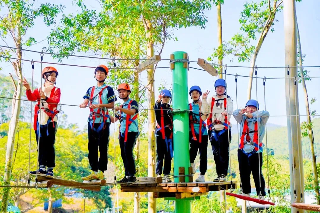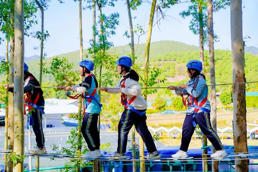 穿梭在林间的绳索与关卡前,同学们眼睛紧盯脚下,手稳稳抓住绳索,哪怕遇到摇晃的踏板,也会调整呼吸慢慢通过。在克服障碍的过程中,专注力与意志力都悄悄 “升级”。