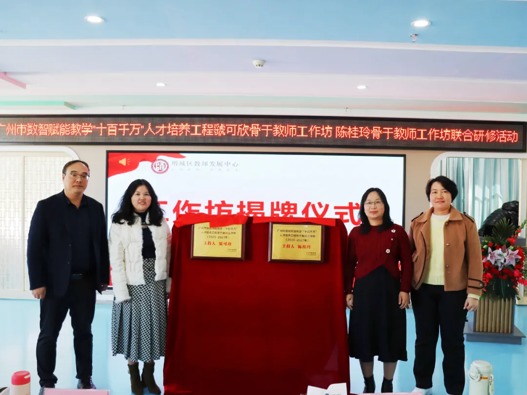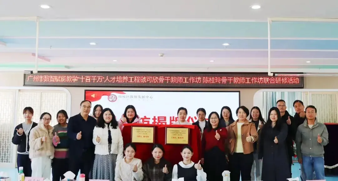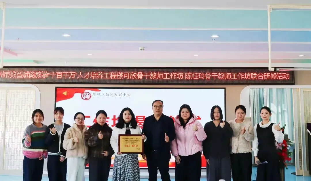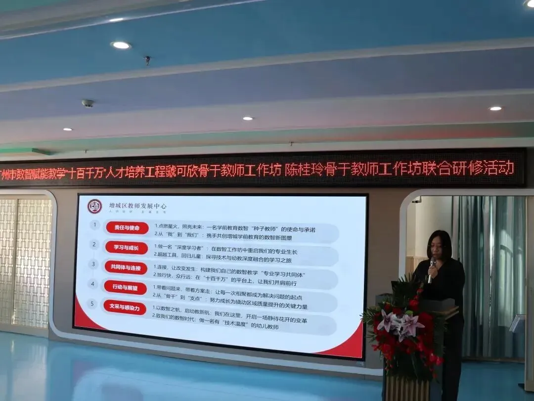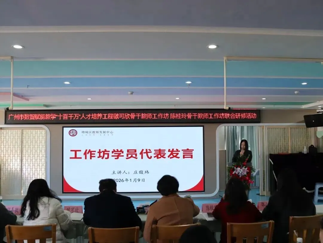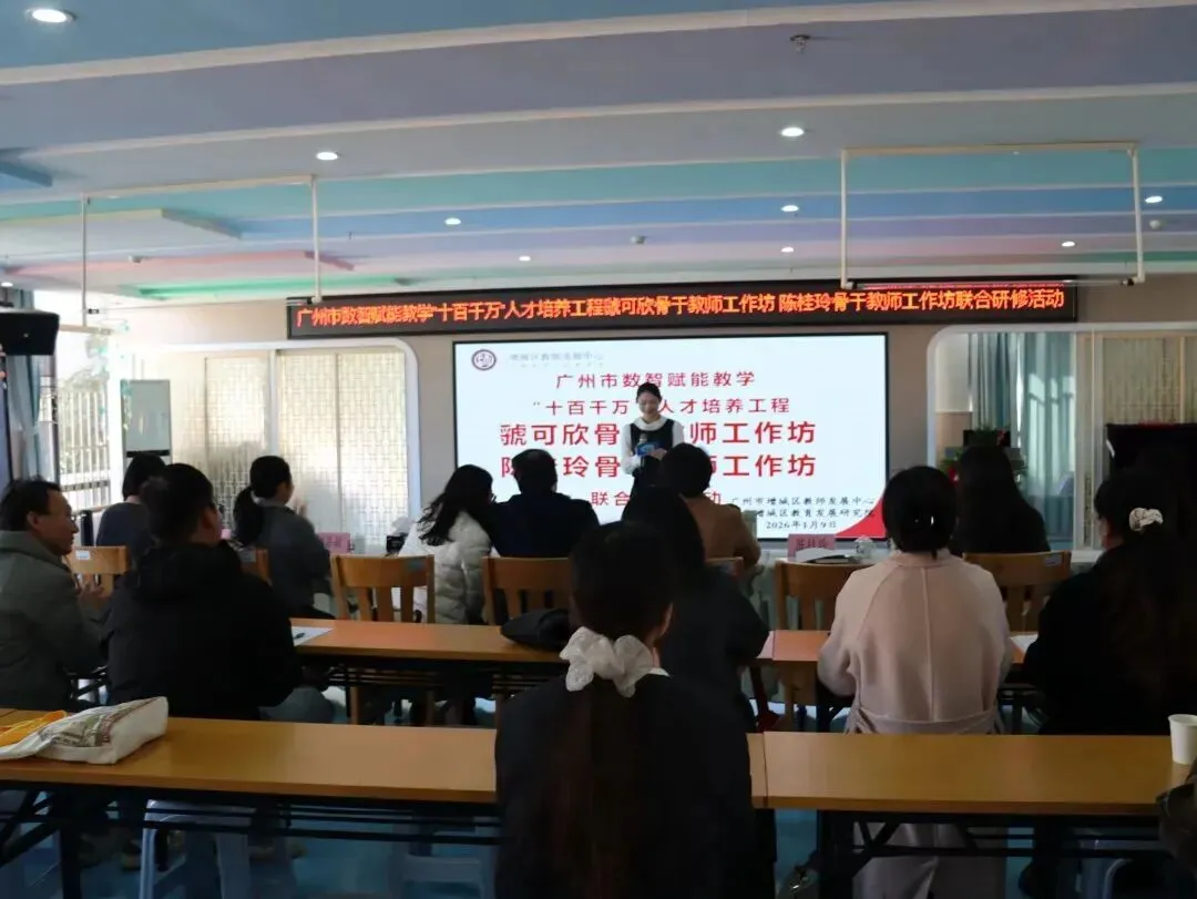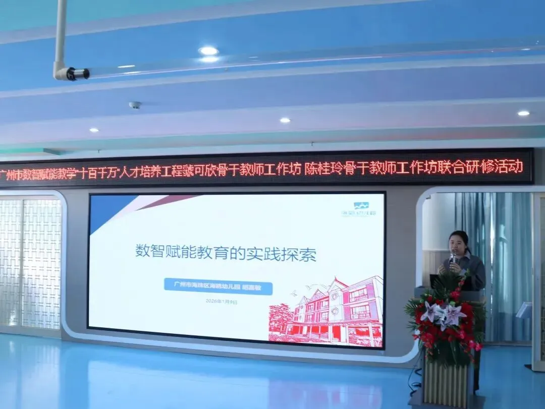2026年1月9日,广州市数智赋能教学“十百千万”人才培养工程虢可欣骨干教师工作坊、陈桂玲骨干教师工作坊联合研修活动在增城区荔城街中心幼儿园顺利举行。活动特邀增城区教师发展中心陈宗兰部长、陈洪义教授,海珠区海鸥幼儿园胡嘉敏老师,工作坊主持人陈桂玲老师、虢可欣老师,荔城街中心幼儿园尹小玉园长及两坊全体学员共同参与。