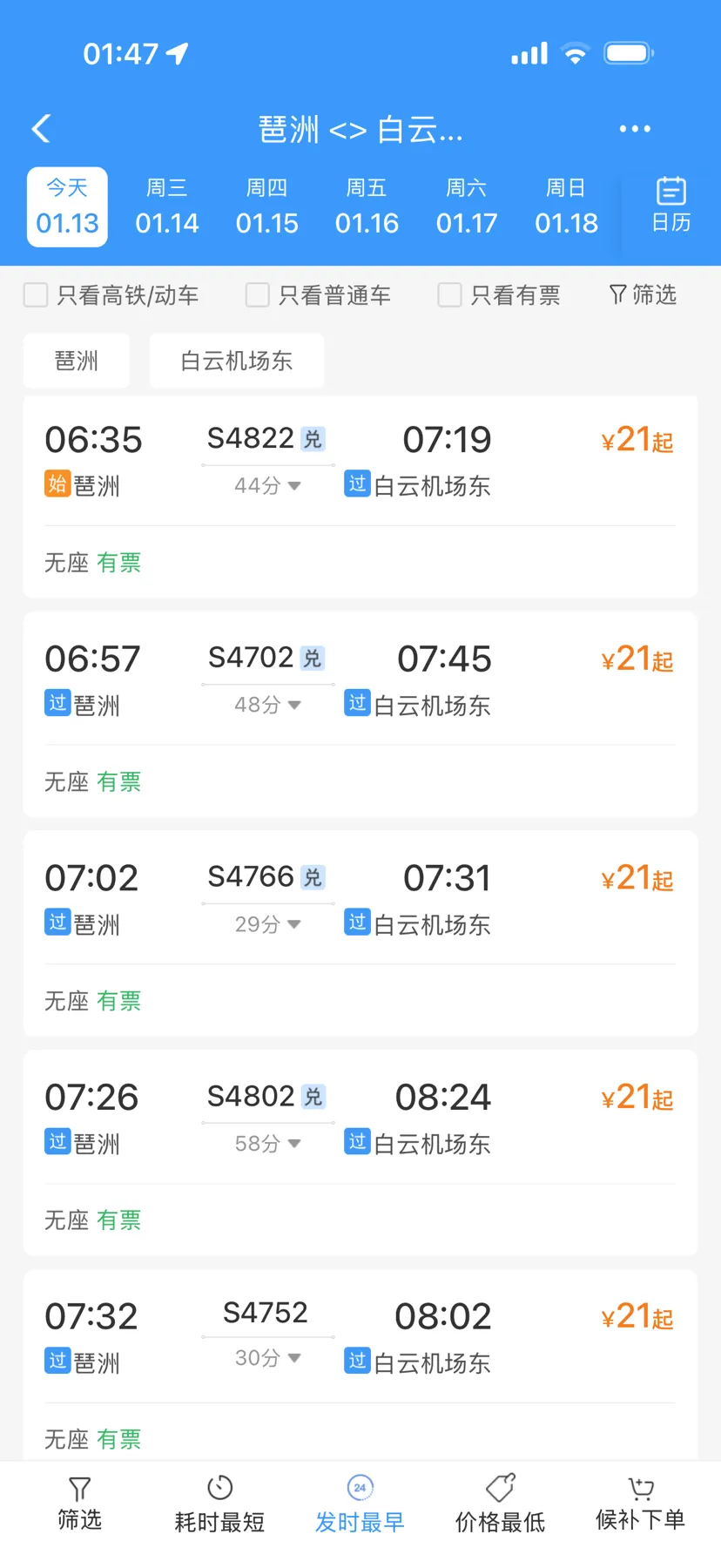 如果从城际琶洲站出发前往白云机场T3航站楼,购票选择的站点是“白云机场东”,快车车程29分钟,如果是“站站停”的慢车,车程则需要58分钟。