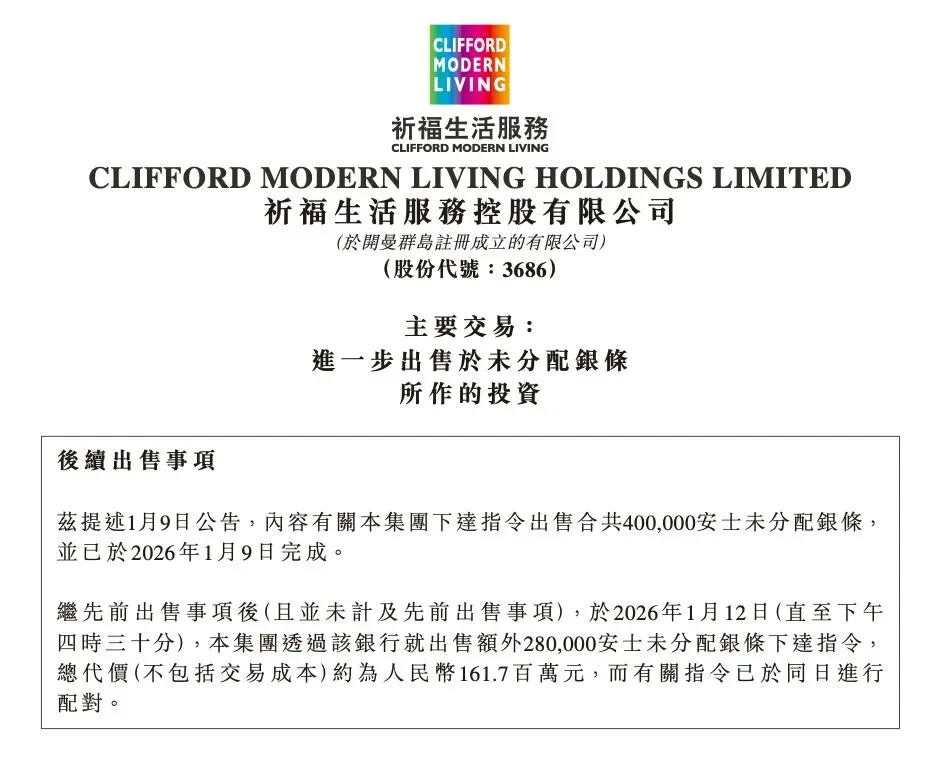 祈福生活服务在公告中表示:“投资未分配银条是作为本集团财务管理的一部分。经考虑未分配银条的当前市场趋势,尤其是近期市价已达近年最高,董事认为,现在是本集团变现部分未分配银条投资的合适时机。”