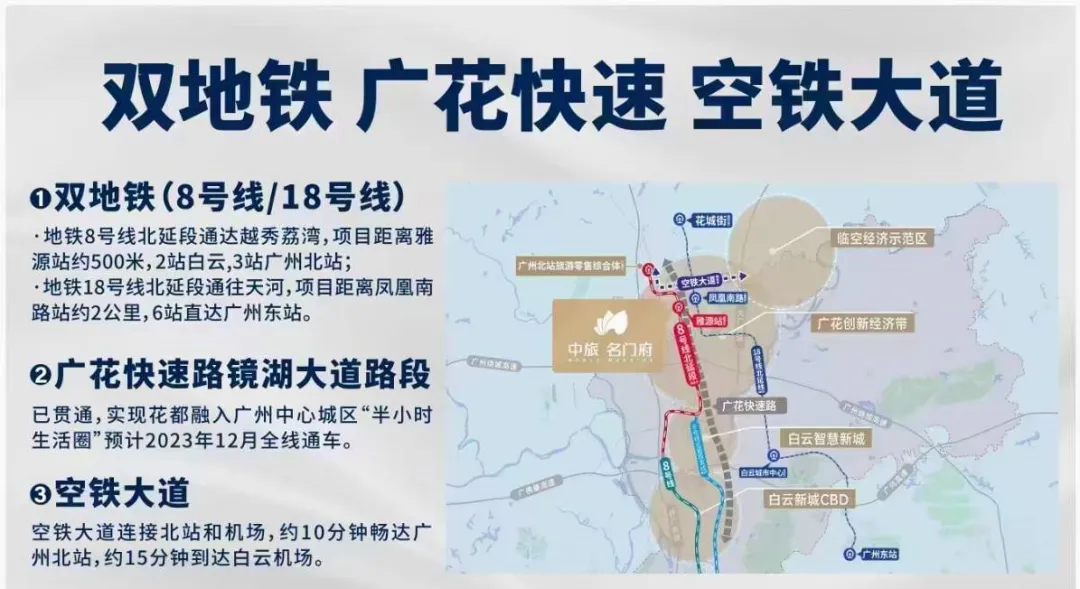 一路通南北,一轨汇东西 广花主轴,未来城市北主轴,作为连接广州北部与市中心的桥梁,重要的南北交通大动脉。家门口在建广花快速路双向8-10车道设计,60公里/小时,白云北开车15分钟就到广州市中心,无缝衔接美好繁华。