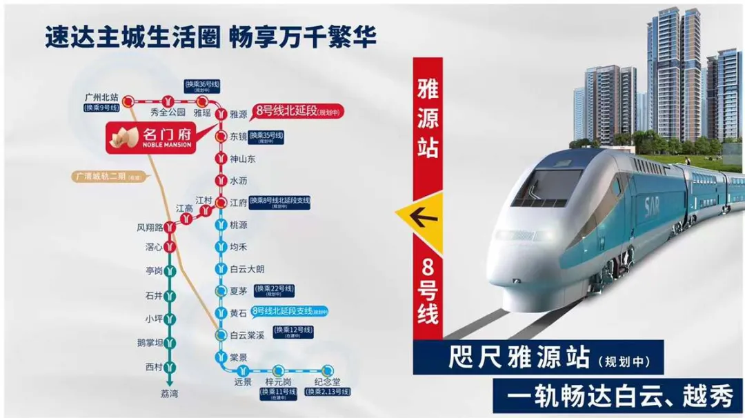 地铁沿线,步行5分钟直达地铁8号线雅源,往北四站接驳广州北站TOD实现空铁联动,往南直达越秀纪念堂站真正享受一小时生活圈