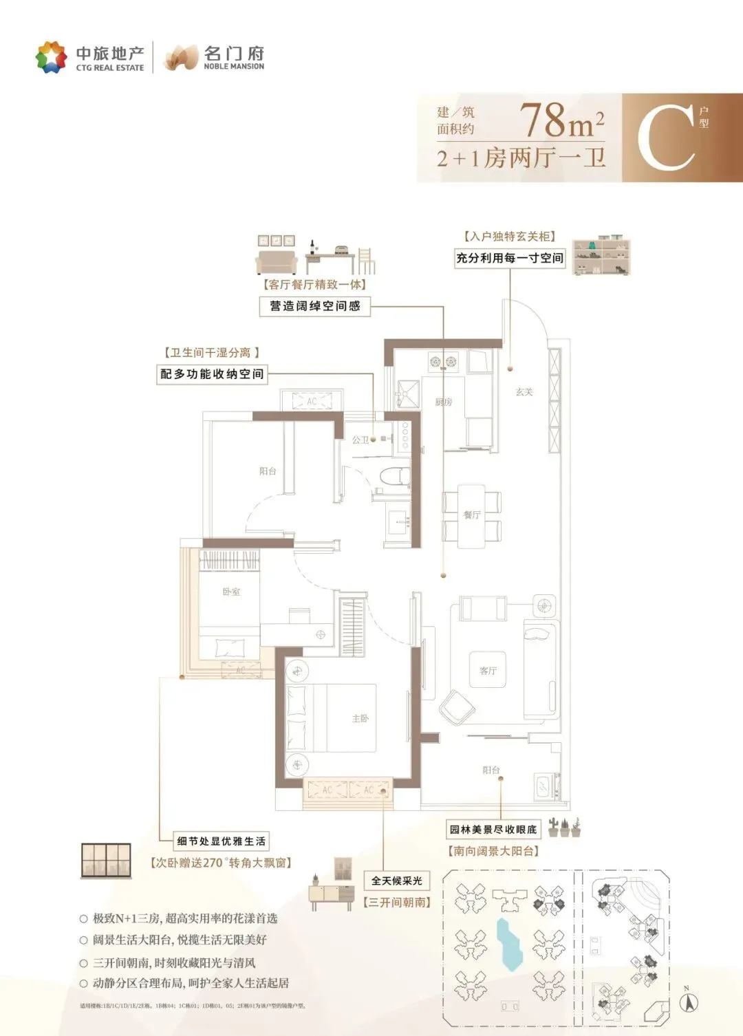 建面约78㎡2+1房,总价低至138万起,采用灵动空间设计,三开间朝南,阔景大阳台。户型整体周正敞亮,分区合理高效,配置入户玄关,低总价上车的同时,顾全生活质量。