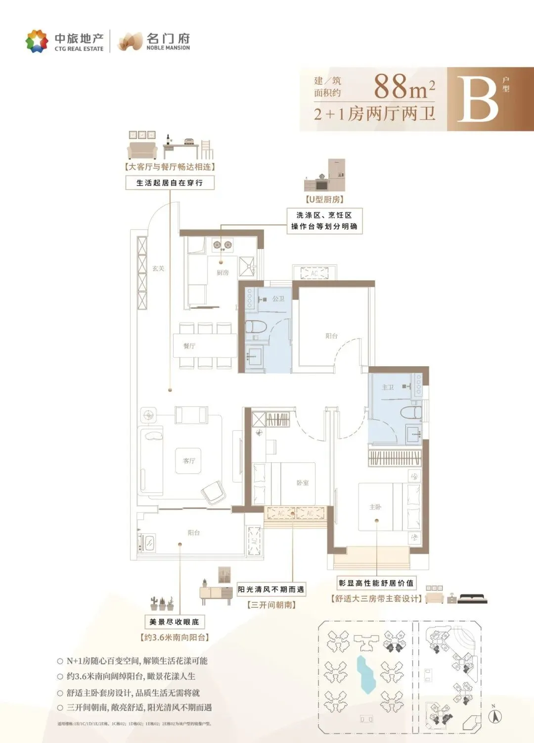 传统建面约88㎡只能做到两室两厅且客餐厅分离,在视觉上造成空间的碎片化。中旅·名门府爆款建面约88㎡户型,大客厅与餐厅畅达相连,使动线更为流畅,便于家庭成员互动交流。同时,U型厨房设计,烹饪游刃有余;套房主卧,多一些私密尊崇。