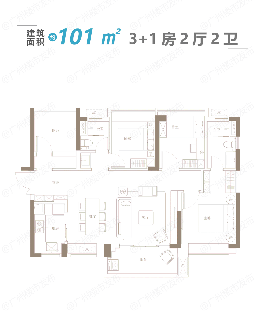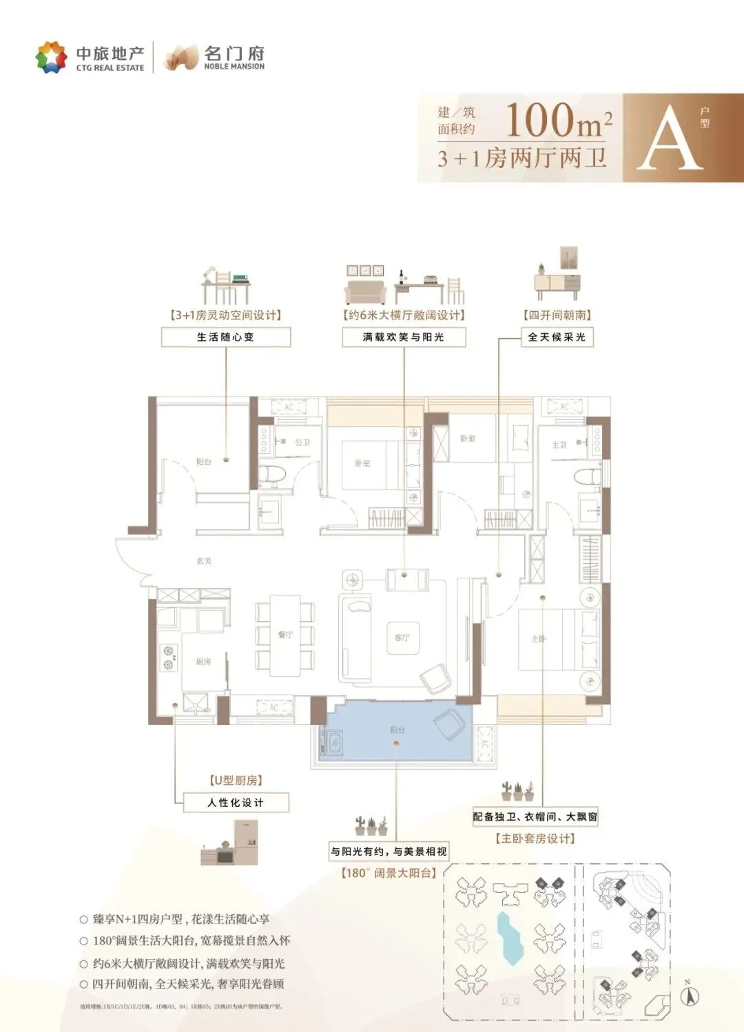 建面约100㎡热捧户型,让每一位家庭成员各有天地,互不叨扰;约6米大横厅敞阔设计,盛放全家志趣;四开间朝南,清风阳光入室;套房主卧,尽显主人尊贵感。