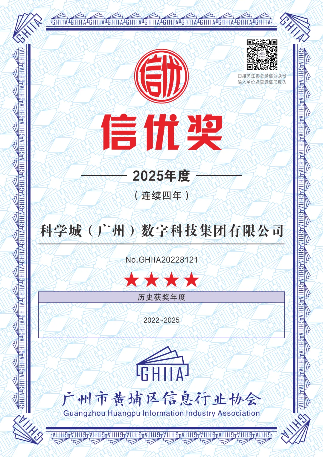 1 | 科学城(广州)数字科技集团有限公司 | GHIIA20228121 | 连续四年 |