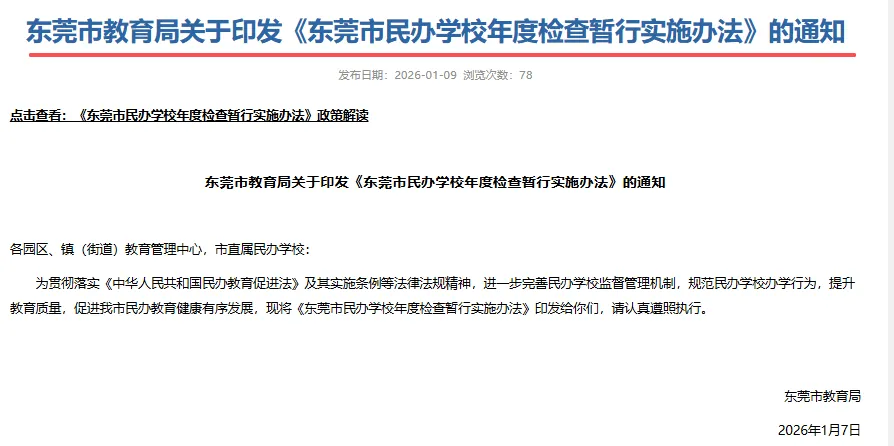 1月9日,东莞市教育局印发《东莞市民办学校年度检查暂行实施办法》的通知,为东莞民办学校办学行为立规矩、划底线,全力护航民办教育健康有序发展。东莞市民办学校年度检查暂行实施办法