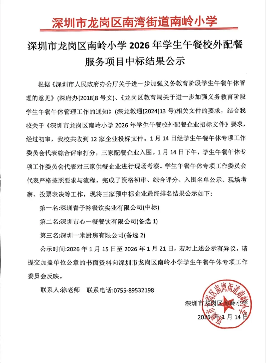 深圳市龙岗区南岭小学2026年学生午餐校外配餐服务项目中标结果公示