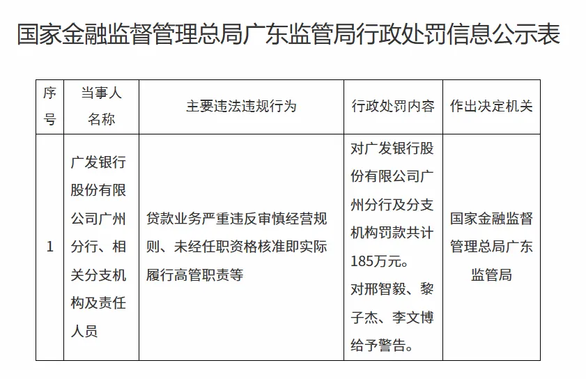 国家金融监督管理总局广东监管分局最近出手,广发银行广州分行及旗下相关分支机构,合计被罚了185万元,还有邢智毅、黎子杰、李文博3名责任人,直接被警告处分。