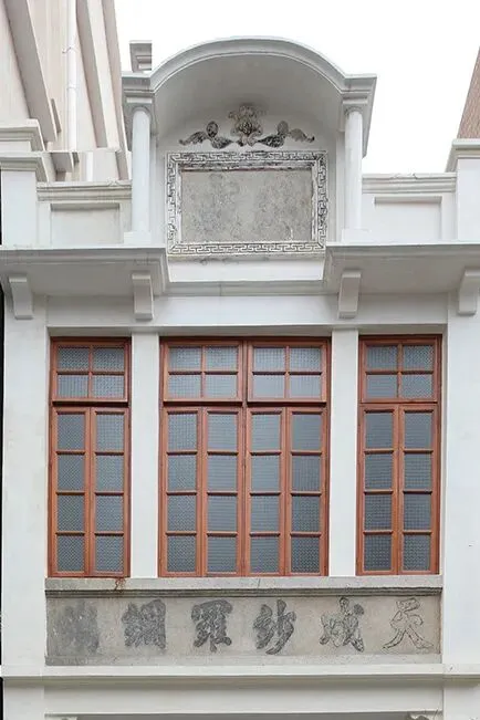 中兴路24号骑楼保存完好的彩玻满洲窗,大西路38号骑楼二层、三层有传统几何形纹饰,均为传统满洲窗的典范。