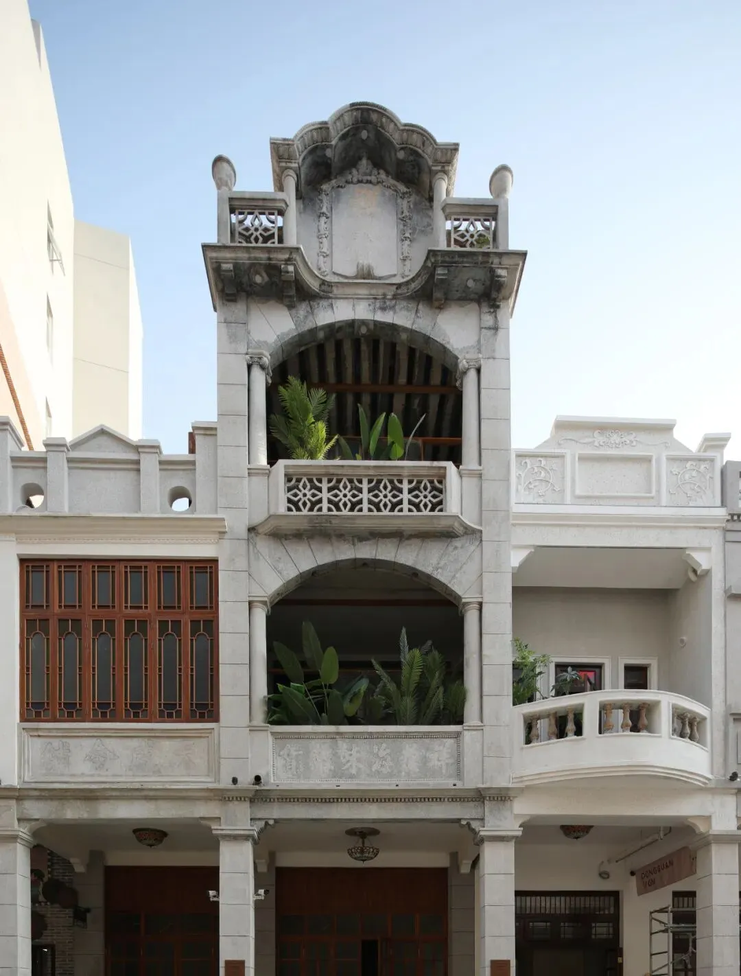 中兴路12-14号骑楼由四栋民国建筑并肩而立,石米立面嵌着西式山花与栏杆,藏着中西合璧的巧思。