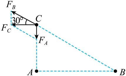【详解】要使C处的正点电荷所受静电力方向平行于AB向左,该正点电荷所受力的情况应如图所示,所以A带负电,B带正电。设A、C间的距离为L,则B、C间的距离为2L。