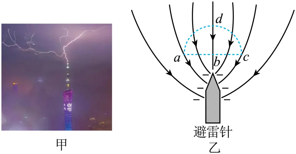 6. 塔尖装有一避雷针,某次雷雨天气闪电击中避雷针,避雷针发生尖端放电现象,如图甲。若避雷针放电时的电场线分布如图乙所示,在空间取一条水平线abc和一条圆弧线adc,bd连线为ac连线的中垂线,电场线关于直线bd对称,以下说法正确的是()