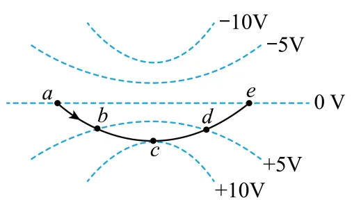 BC.由A选项可知,粒子带正电,因此粒子从a点到c点的过程中,电势能增大,电场力做负功,因此粒子动能减小,即速度减小,当粒子从c点到e点的过程中,电势能减小,电场力正功,因此粒子动能增大,即速度增大,所以粒子速度先变小后变大,故B错误,C正确;