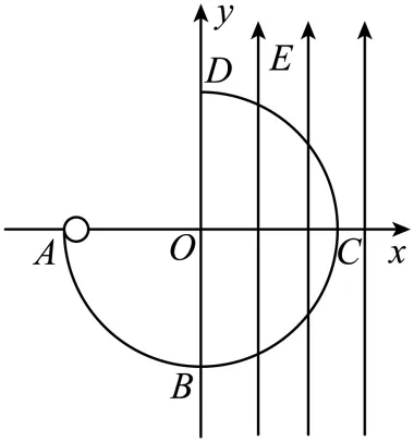 18. 如图所示,ABCD是半径为R的四分之三光滑绝缘圆形轨道,固定在竖直面内。以轨道的圆心O为坐标原点,沿水平直径AC方向建立x轴,竖直直径BD方向建立y轴。y轴右侧(含y轴)存在竖直向上的匀强电场。一质量为m、带电量为+q的小球,从A点由静止开始沿轨道下滑,通过轨道最高点D后,又落回到轨道上的A点处。不考虑小球之后的运动,不计空气阻力,重力加速度为g,求: