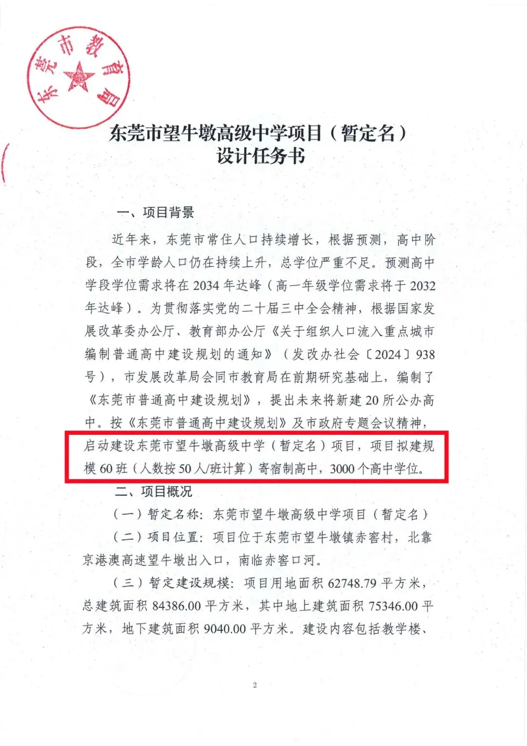 学校建设占地面积62748.79平方米,总建筑面积84386平方米,拟新建一所60班规模的公办高级中学,预计每班50人左右,可提供3000个公办高中学位,大幅缓解区域公办高中学位压力。