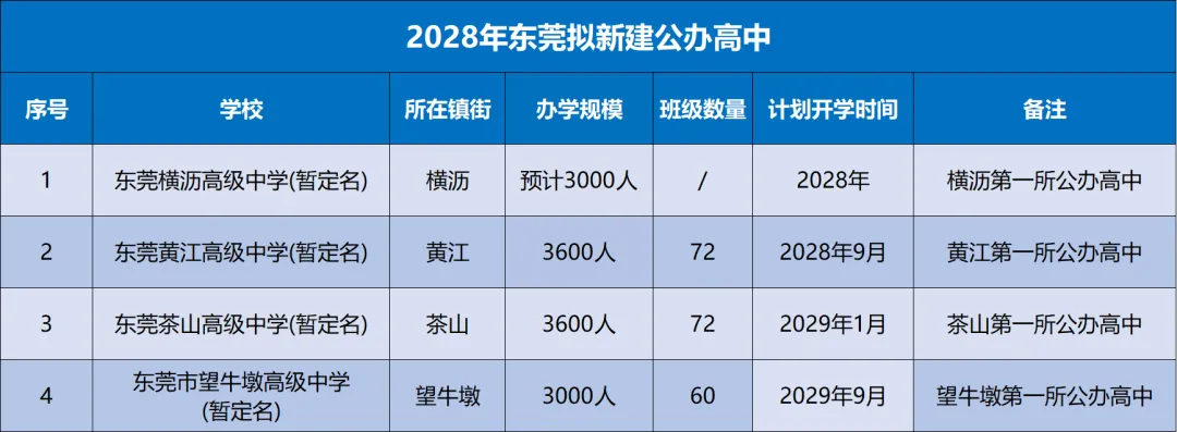据统计,预计2028年东莞将新建成至少4所公办高中,分别为东莞横沥高级中学(暂定名)、东莞黄江高级中学(暂定名)、东莞茶山高级中学(暂定名)、东莞市望牛墩高级中学(暂定名),预计新增公办高中学位13200个。