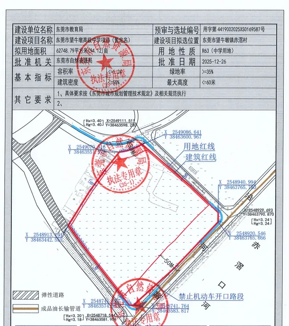 望牛墩高级中学选址望牛墩镇赤滘村,北靠京港澳高速望牛墩出入口、南临赤滘口河,地块周边道路基本建成,交通便利。