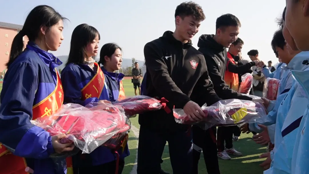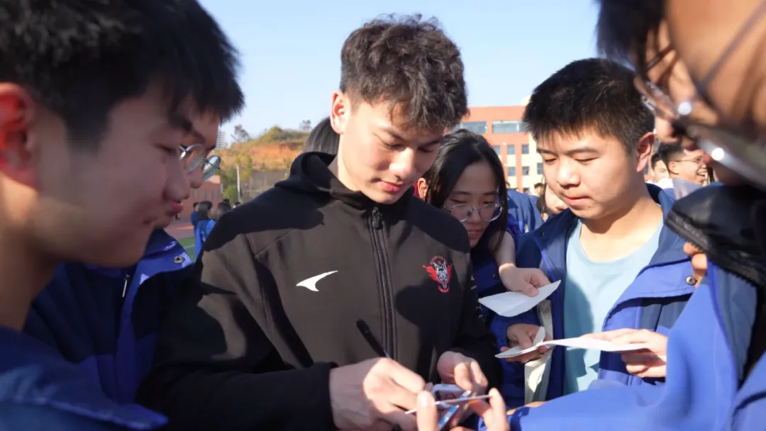 公益团队的到来,瞬间点燃了全校师生的热情,校园内掌声与欢呼声此起彼伏。尤其是有着 “核武 7” 之称的球星王博惊喜空降,让学弟学妹们直呼 “圆梦”!大家纷纷围拢上前,签名、合影、拥抱,近距离与偶像互动,操场上欢呼声、呐喊声不断,热血氛围拉满。