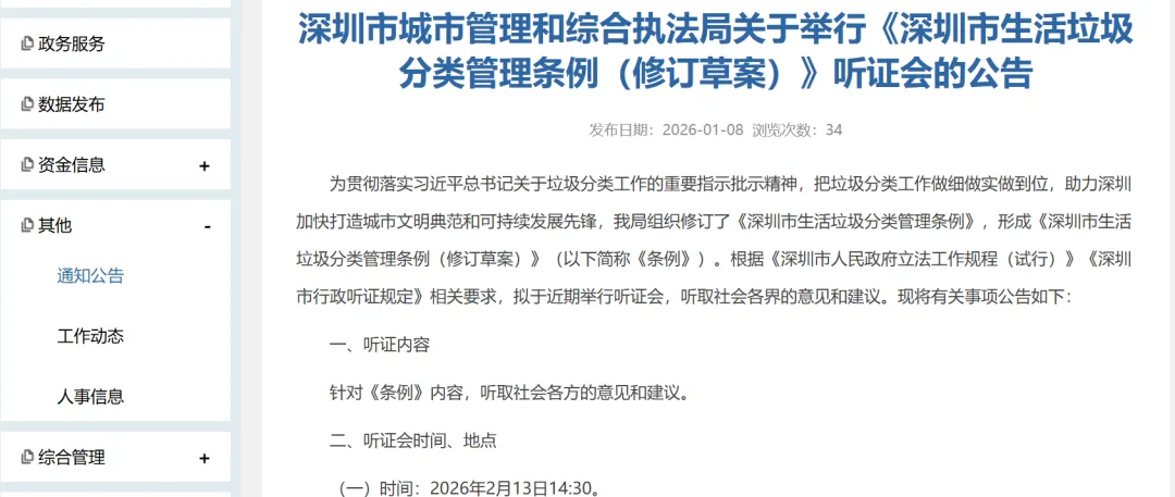 深圳在垃圾分类管理方面的制度创新从未停止,2026年1月7日深圳市城管局发布公告,计划在2月13日举行《深圳市生活来及分类管理条例(修订草案)》听证会。