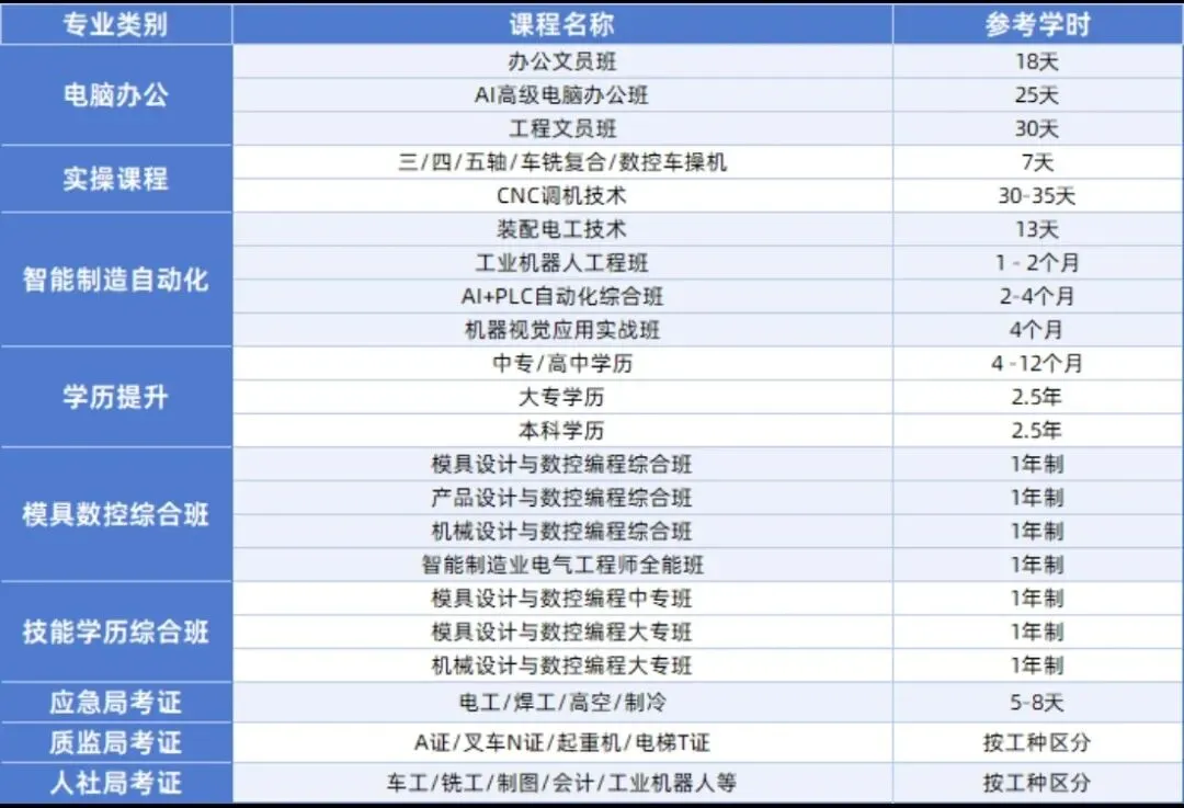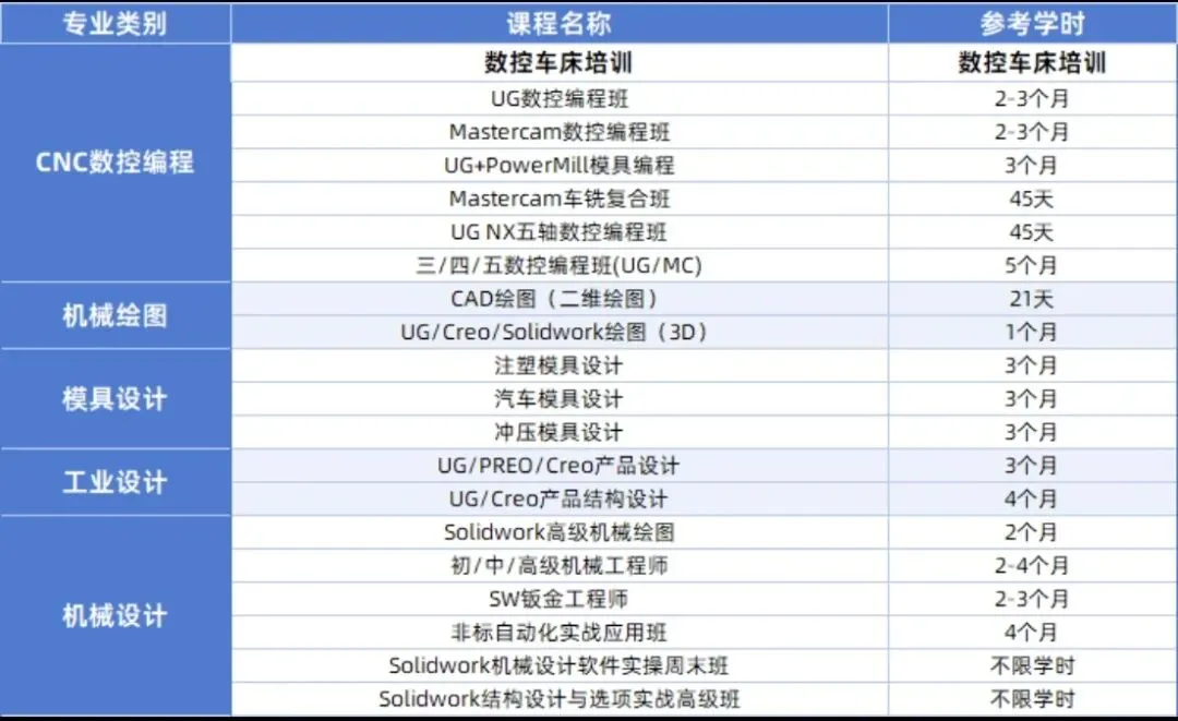 UG数控编程、MC数控编程、数控车床、UG+PM模具编程、硅胶模具编程、模具设计、CAD绘图、UG/CREO绘图、Preo/Creo产品设计、结构设计、Solidworks绘图、Solidworks钣金设计、初/中/高级机械设计工程师、五金模具设计、装配电工、中/高级PLC自动化编程、工业机器人编程、机器视觉等。
