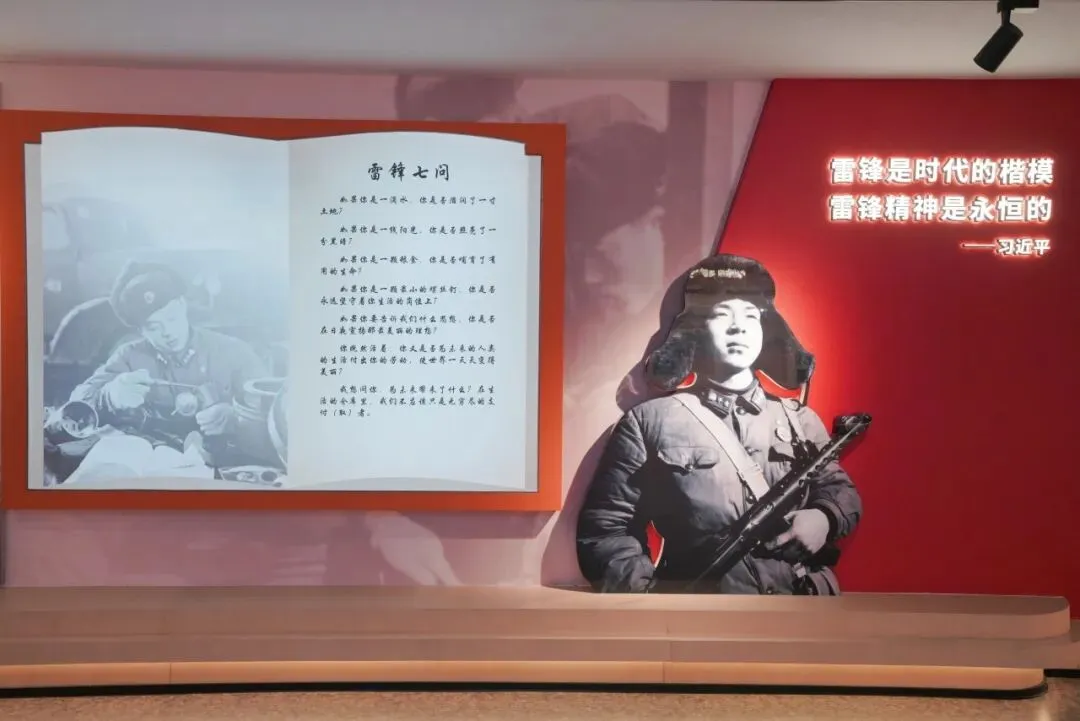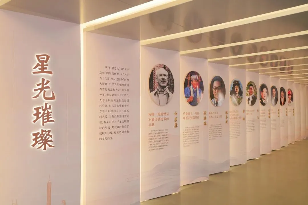 两侧展墙整齐陈列着古今中外奉献者的名言金句与感人事迹,灯光柔和映衬,随手一拍都是兼具情怀与质感的大片。