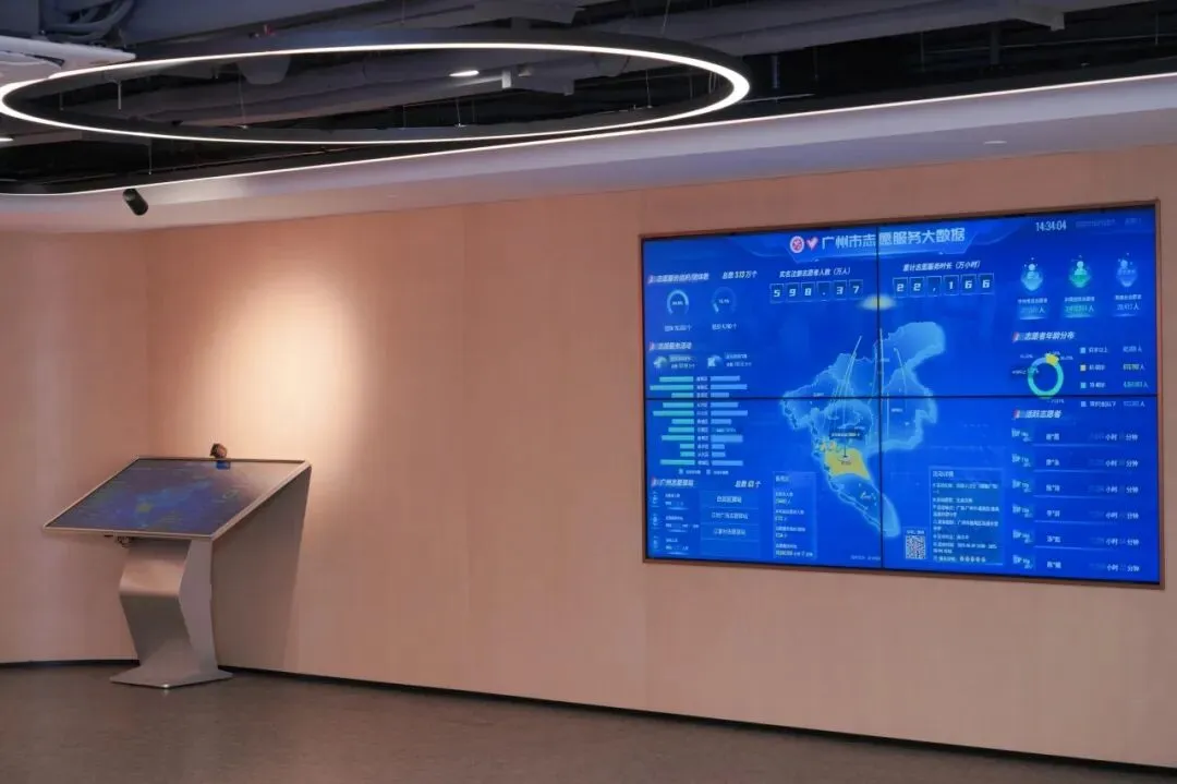 广州全市志愿服务驿站分布地图、志愿者跨越山海的全国服务足迹动态铺展,光影流转间仿佛置身庞大志愿网络的核心。