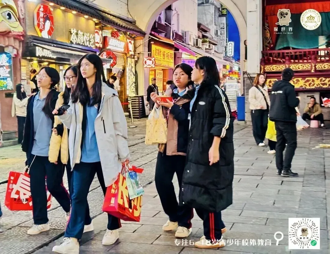 告别橘子洲头的庄严肃穆,同学们走进了充满市井活力的坡子街。这里商铺林立,吆喝声、欢笑声交织在一起,浓浓的烟火气扑面而来。