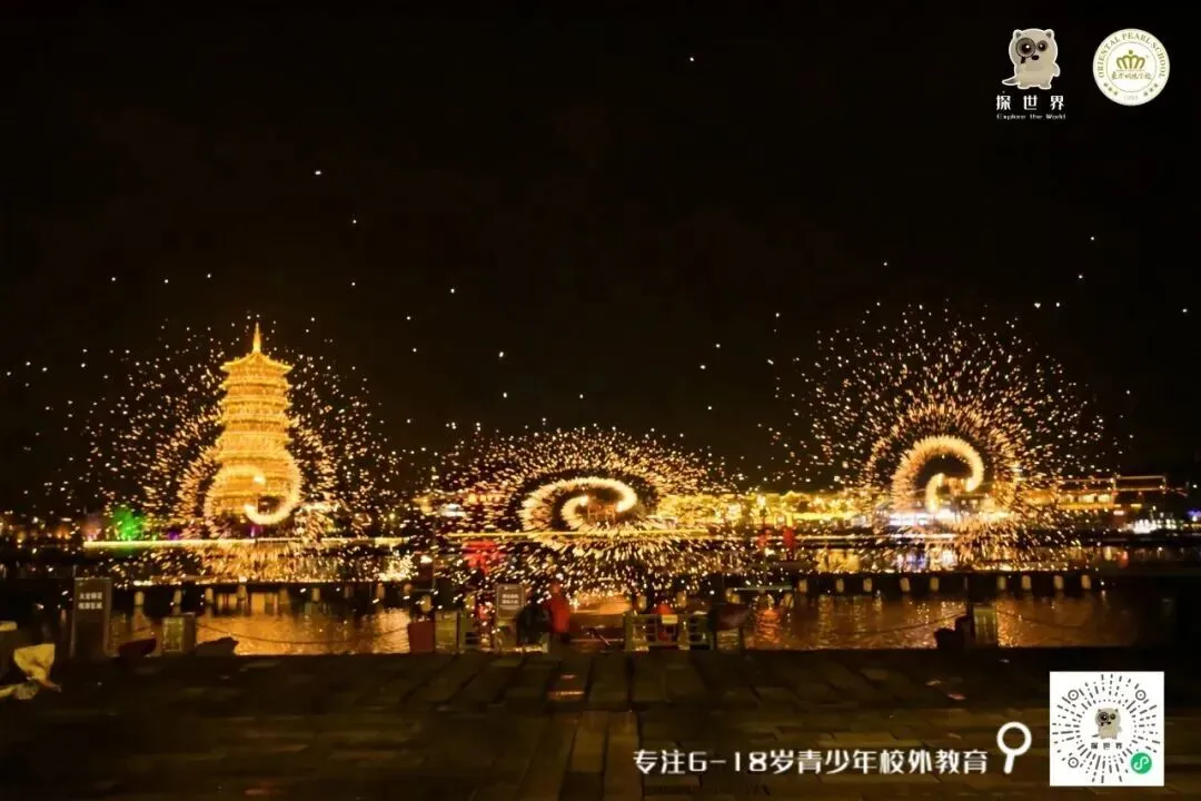 夜幕降临,最令人期待的国家级非物质文化遗产 —— 打铁花表演震撼登场。匠人师傅们将炽热的铁水奋力击打向夜空,千点万点金花瞬间绽放,似烟花绚烂夺目,又像银河倾泻人间。同学们纷纷驻足惊叹,欢呼声此起彼伏,这穿越千年的文化烟火,不仅照亮了夜空,更照亮了传统文化的传承之路,让大家深深感受到了非遗文化的独特魅力。