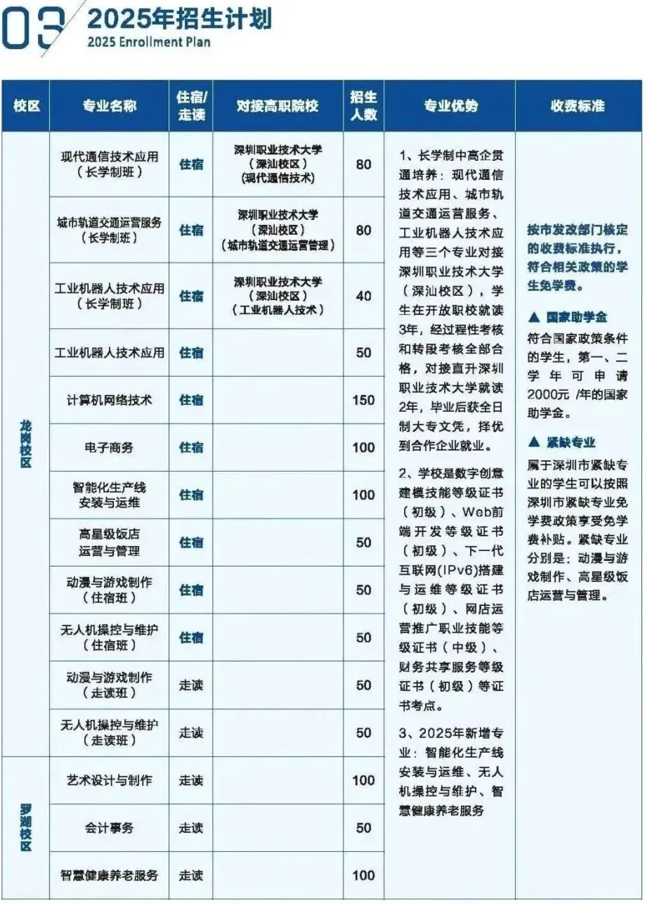 创办于1985年,是深圳开放大学主办的市属公办中职学校,为深圳市东部职业教育集团成员校。秉承“产教融合、德技并修”理念,开设城市轨道交通运营服务、工业机器人、计算机网络技术等12个特色专业,对接深圳支柱产业需求。与华为、深圳职业技术大学等共建“长学制”贯通培养通道,学生合格后可升入高职获得全日制大专学历。推行国际化合作办学,构建多元育人体系。拥有现代化教学与实训设施,师资队伍专业能力突出,助力学生掌握前沿技能,实现高质量就业与升学。