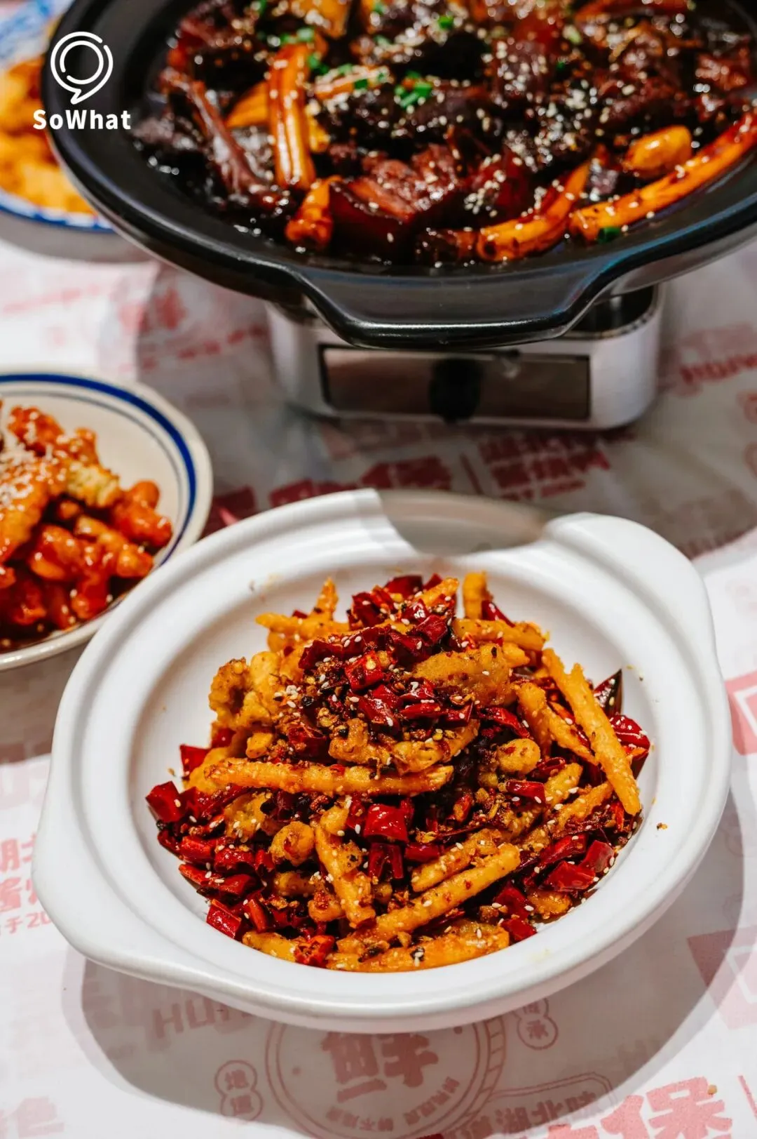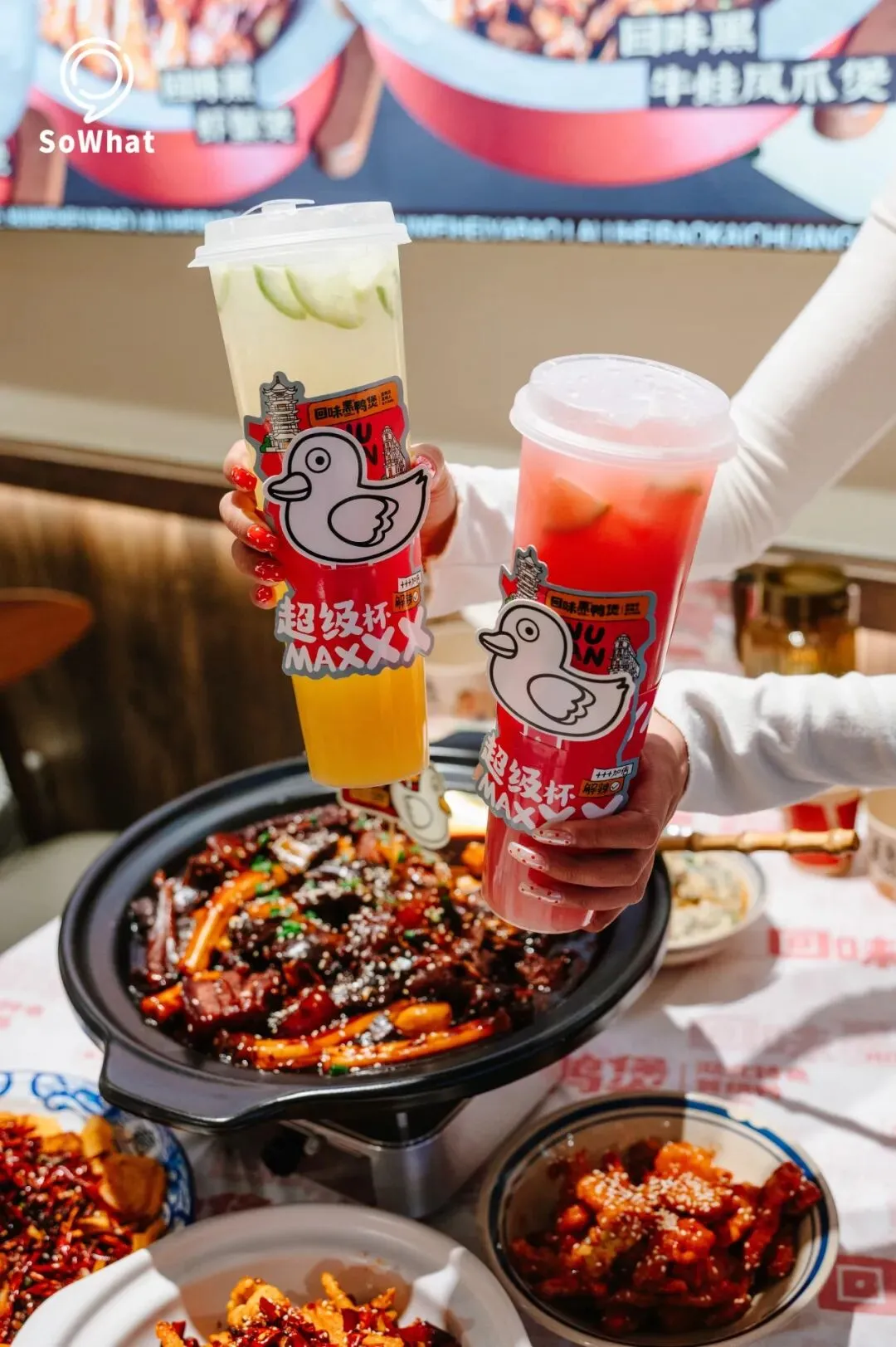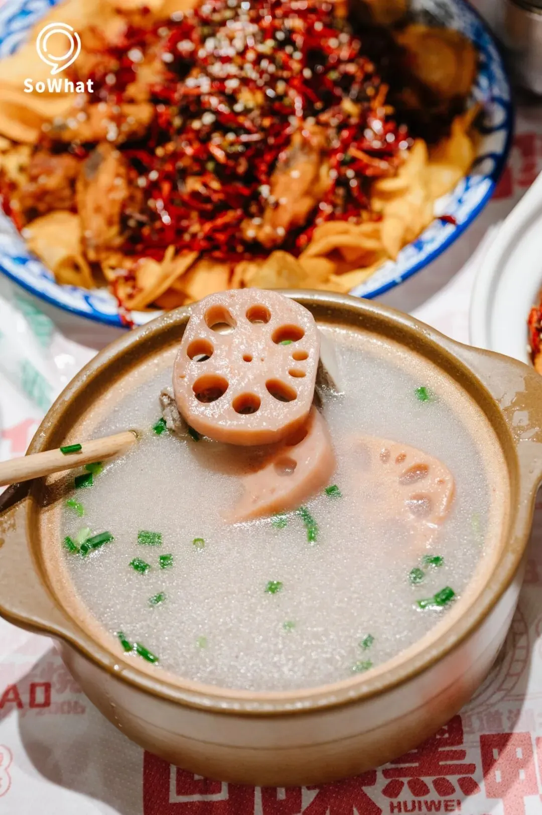 一锅炖煮入味的黑鸭煲配以筋喜粉,再点上麻辣薯片鸡翅、小酥肉等,香辣过瘾!如果辣意上头,除了冰冻果汁,一煲洪湖藕汤也能让你缓一缓哦。