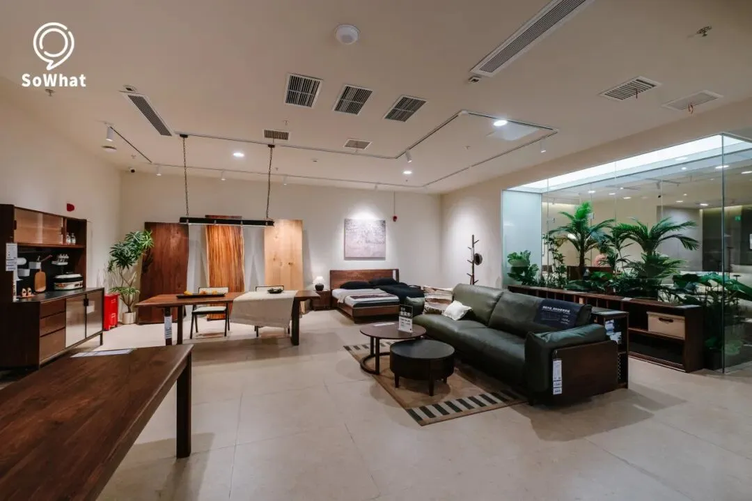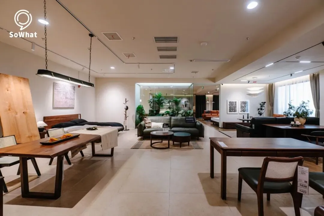 与前两站的活泼轻盈不同,走进源氏木语,脚步和呼吸会不自觉慢下来。实木家具泛着自然的光泽与纹理,桌椅、柜架、家居摆件,都透着一种踏实温润的质感。