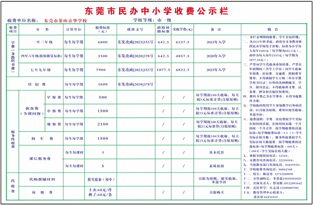 东莞市茶山京华学校严格按照上级相关部门规定项目进行收费,为了让各位家长更加清楚地了解学校的收费标准,现将2026年春季学期收费公示如下:
