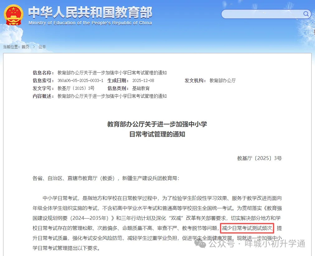 12月17日,教育部发布了《关于进一步加强中小学日常考试管理的通知》