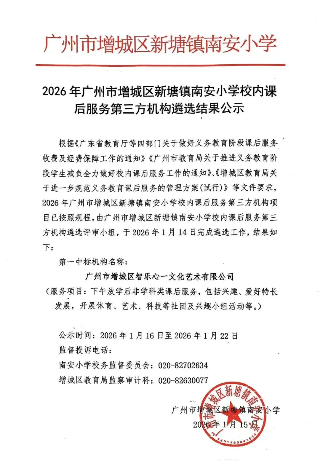 广州市增城区新塘镇南安小学校内课后服务引进第三方机构遴选结果公示